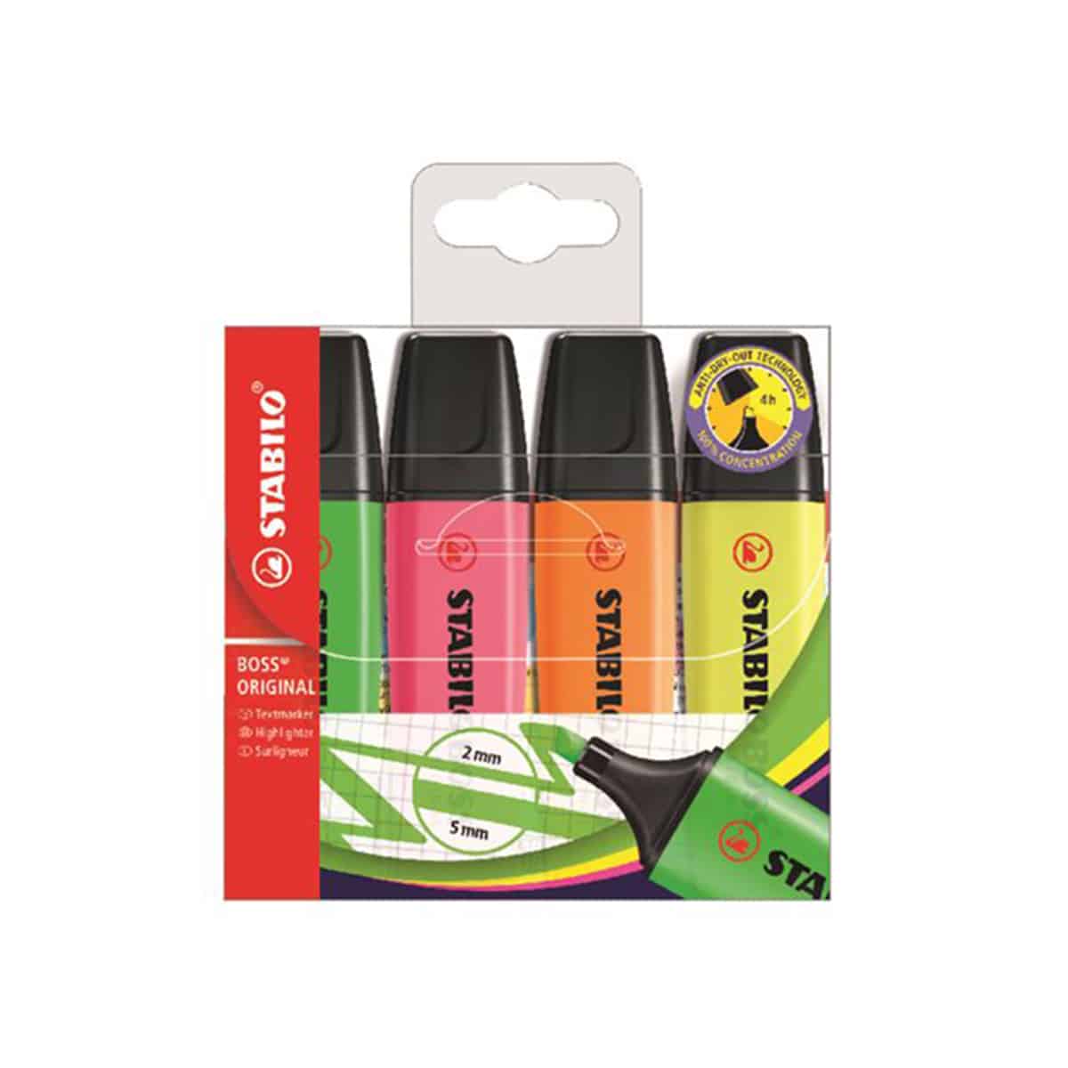 Ensemble de 4 surligneurs BOSS ORIGINAL. Ces surligneurs peuvent rester 4h sans capuchon sans sécher. 2 largeurs de tracé: 2 mm et 5 mm. Encre à base d’eau. Couleurs assorties : jaune, vert, orange, rose.