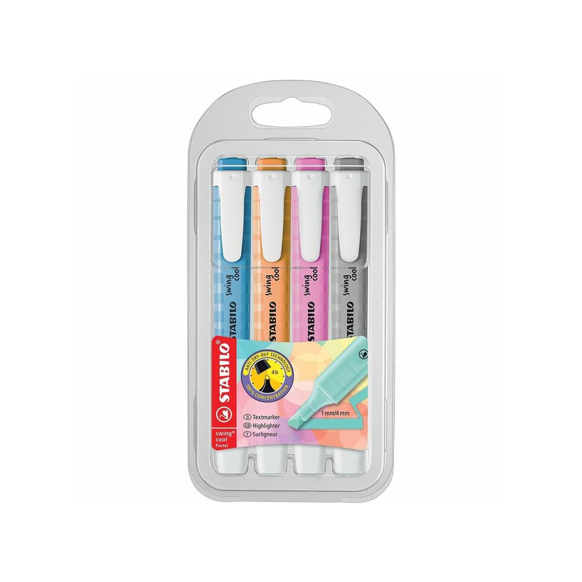 Ensemble de 4 surligneurs Swing Cool. Ces surligneurs peuvent rester 4h sans capuchon sans sécher. 2 largeurs de tracé: 1 mm et 4 mm. Encre à base d’eau. Modèle de poche avec agrafe. Couleurs assorties Pastel Set#3 (Bleu – Orange – Fuchsia – Gris)
