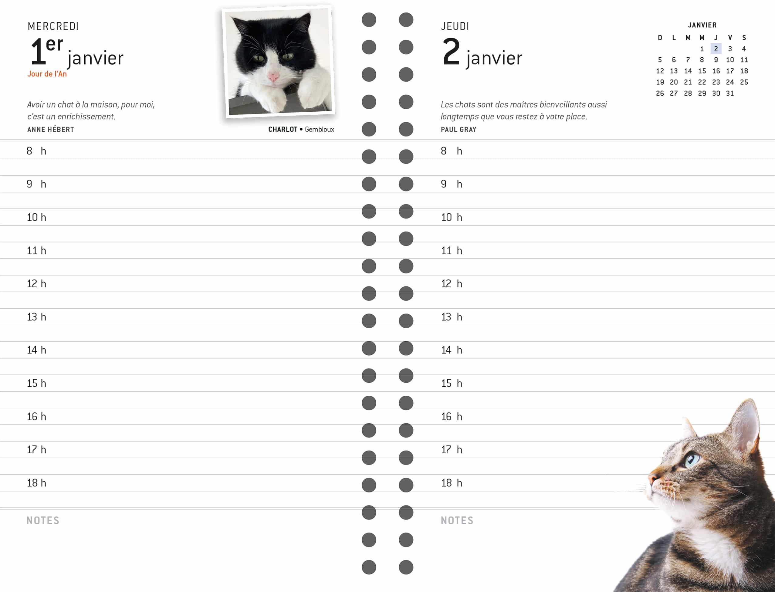 • Organisation quotidienne : une page pour chaque jour de la semaine, du 1er janvier au 31 décembre;