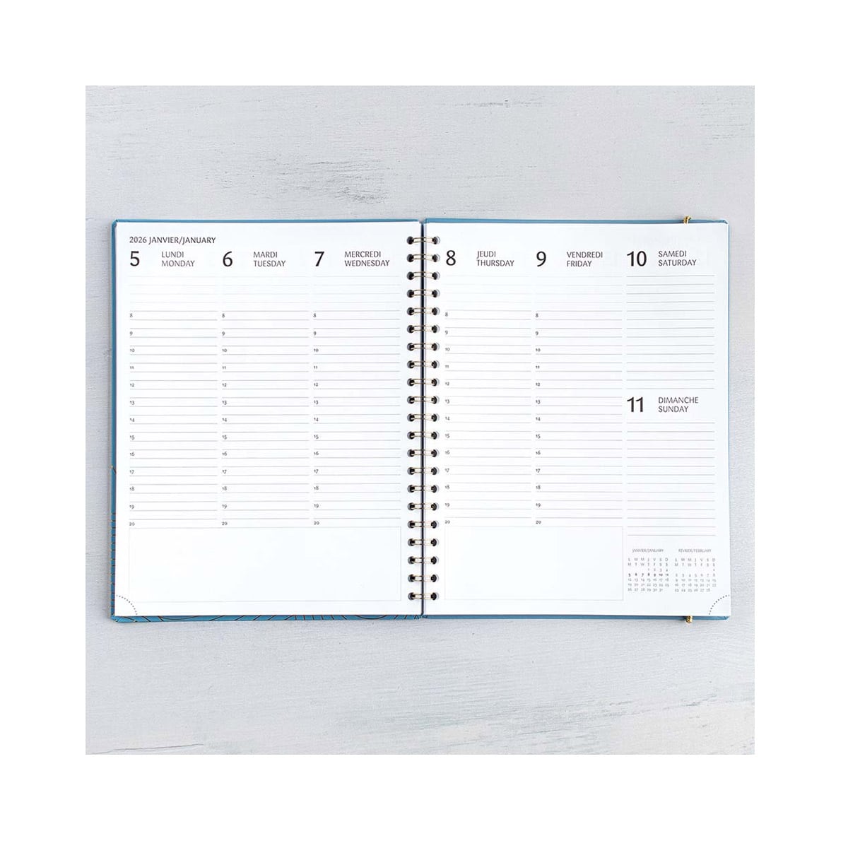 Le Kibo est très populaire parmi la population étudiante. Sa fonctionnalité a fait ses preuves. De grandes pages format lettre, la semaine bien en vue avec sa grille de 1 semaine sur 2 pages et un encadré spacieux sur chaque page pour noter tout ce qui vous passe par la tête. Il inclut aussi 14 pages de notes. La reliure spirale permet de l’ouvrir à 360 degrés et d’écrire partout où vous vous trouvez. Il est facile d’être toujours à la bonne page grâce à ses coins détachables.
