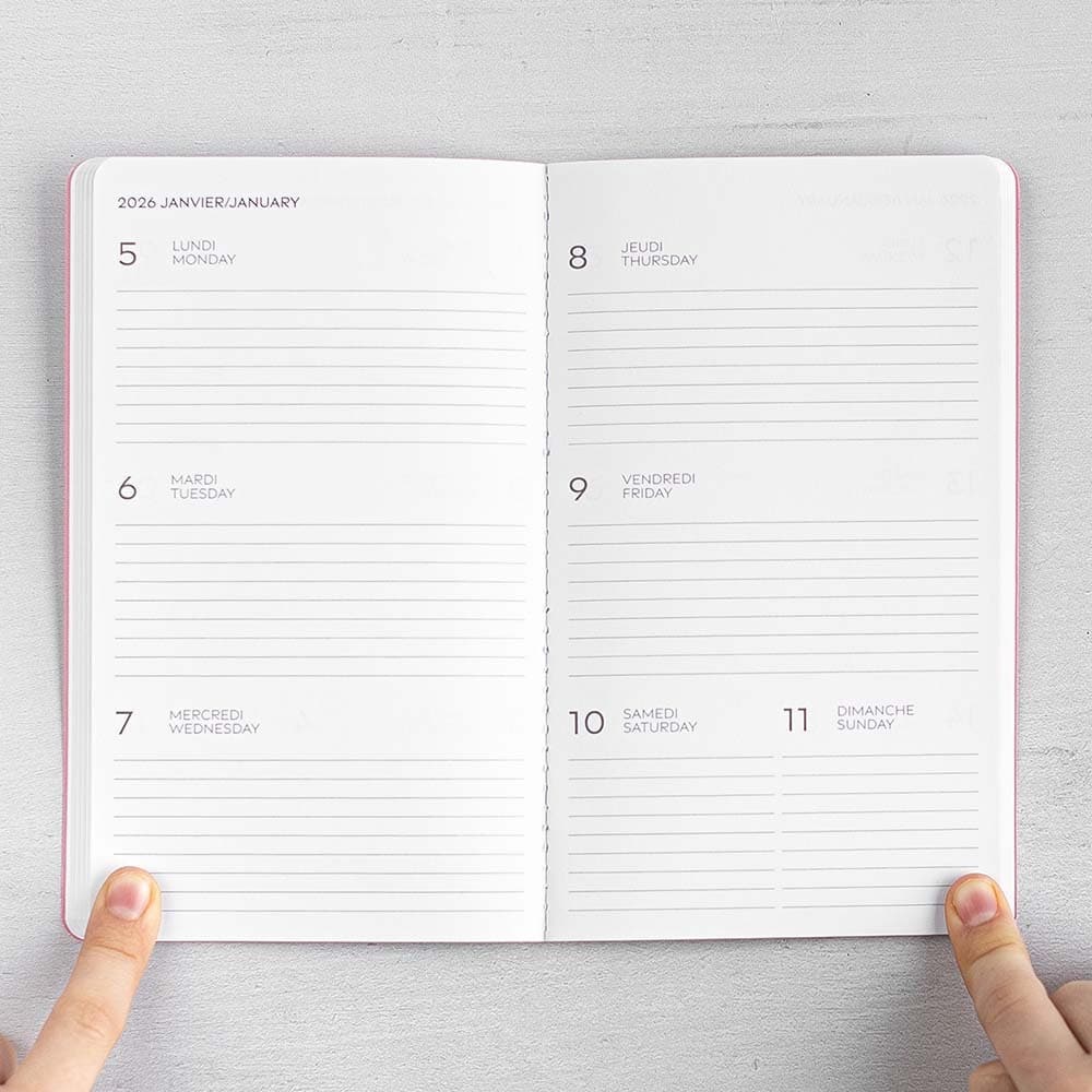 L’espace de planification reste ample avec sa grille d’une semaine sur deux pages, ses calendriers mensuels et pages de notes. Son format de poche en fait un compagnon de voyage parfait.