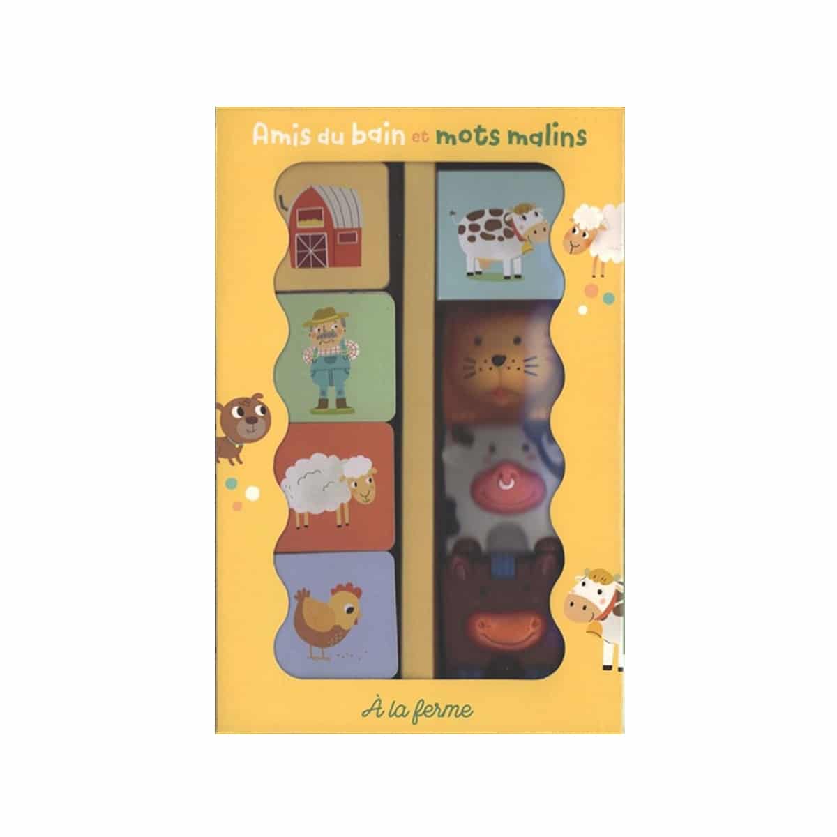 Amis du bain et mots malins . Que d’amusement avec ces cubes et livres sur le thème de la Ferme !. Grâce aux cinq livres illustrés, votre enfant Fera la connaissance de nombreux animaux et découvrira l’univers de la Ferme. Et grâce aux trois cubes pour le bain, il pourra même jouer dans l’eau avec son animal préféré!