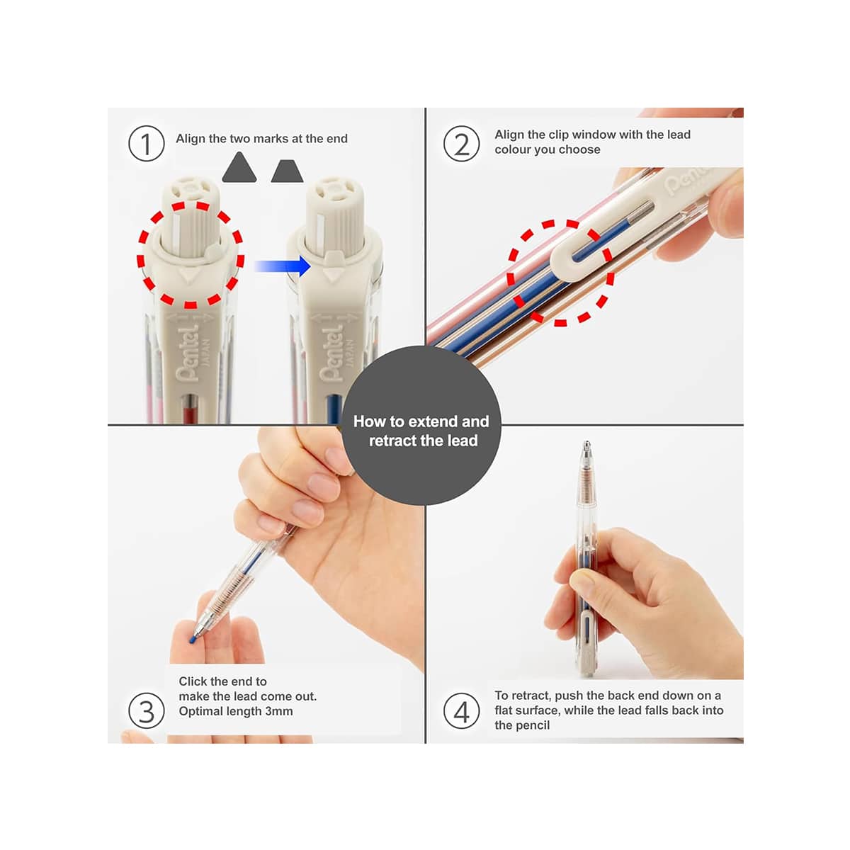 Idéal pour les designers et les artistes, ce porte-mines permet d’utiliser huit recharges différentes ! Il suffit de tourner la pince en plastique pour sélectionner la couleur souhaitée, puis d’appuyer sur le bouton supérieur pour libérer la mine. Léger et ergonomique, ce porte-mine en plastique transparent offre une prise en main équilibrée grâce à sa zone de préhension striée et facilite le choix de la couleur.