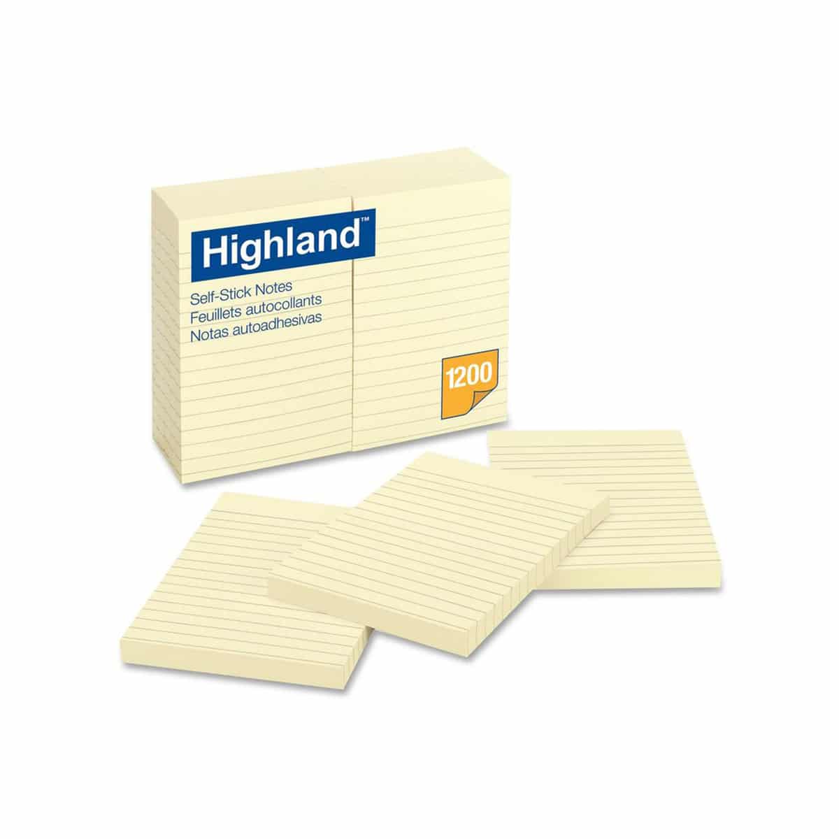 Bloc de 100 feuillets. Paquet de 12 blocs. Jaune, ligné. 4 x 6 po.