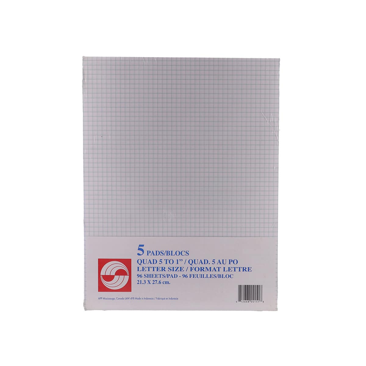 Bloc-notes quadrillé 5-1″ Feuilles gommées sur le dessus 5 blocs / paquet Lignes quadrillées, 5 carrés pour 1″ 96 feuilles / bloc 21.3 x 27.6cm