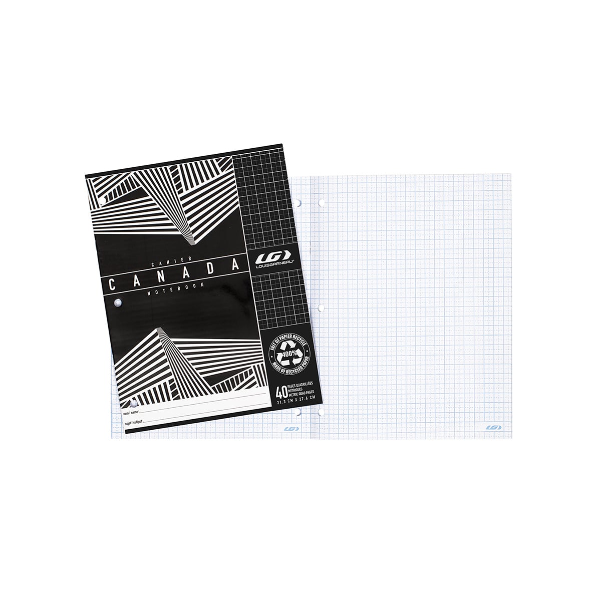 Cahier Canada, fait de papier recyclé, 40 pages quadrillés, couvertures laminées, perforé 3 trous. 27.6 cm X 21.3 cm.