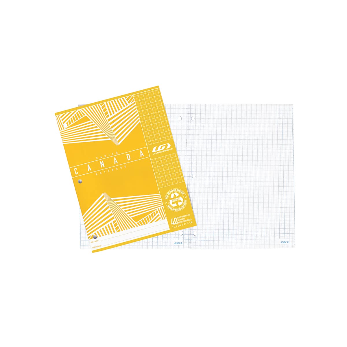 Cahier Canada, fait de papier recyclé, 40 pages quadrillés, couvertures laminées, perforé 3 trous. 27.6 cm X 21.3 cm.