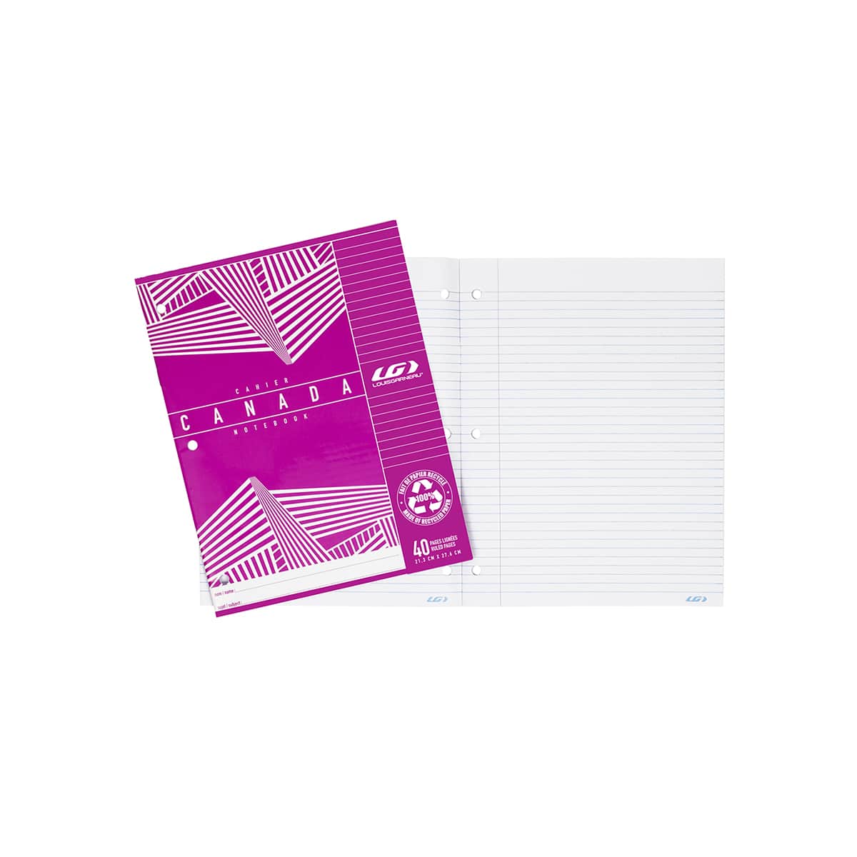 Cahier Canada, fait de papier recyclé, 40 pages lignées, couvertures laminées, perforé 3 trous. 27.6 cm X 21.3 cm.