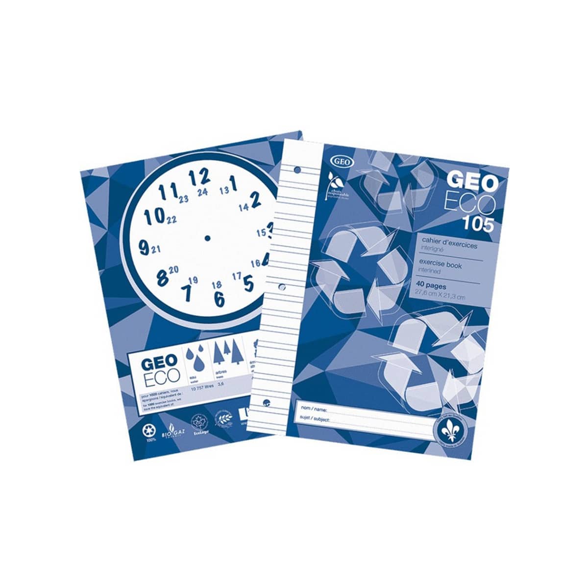 40 pages. 8-1/2 x 11″. Contenu recyclé : 100 %. Interligné, bleu.