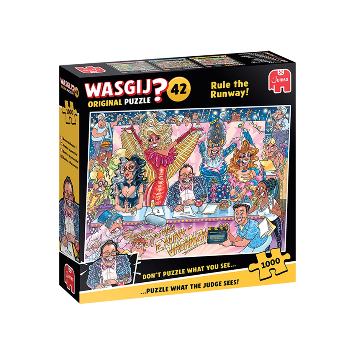renez la pose, c’est le moment de faire sensation au concours de drag queens le plus acharné du monde ! Les caméras tournent, les juges glamour sont prêts et attendent que les participants montent sur le podium. Mais sont-ils vraiment préparés au spectacle complétement fou que ces reines de beauté leur réserve ? Qu’est-ce qui a bien pu laisser les juges, et l’équipe de télévision, complètement sans voix ? Les juges en croient à peine leurs yeux, mais ont-ils été aveuglés par les paillettes ou ce show sensationnel est-il le plus stupéfiant jamais organisé à ce jour ? C’est la scène que vous devez reconstituer ! Wasgij est un concept de puzzle unique qui met à l’épreuve même les plus enthousiastes. Avec les puzzles traditionnels, l’objectif est de construire l’image exacte présentée sur la boîte, mais avec Wasgij, vous devez créer une image totalement différente. Utilisez votre imagination pour reconstituer la scène hilarante que les personnages de l’image de la boîte peuvent voir. 1000 mcx Dimension du casse-tête: 49 x 68 cm