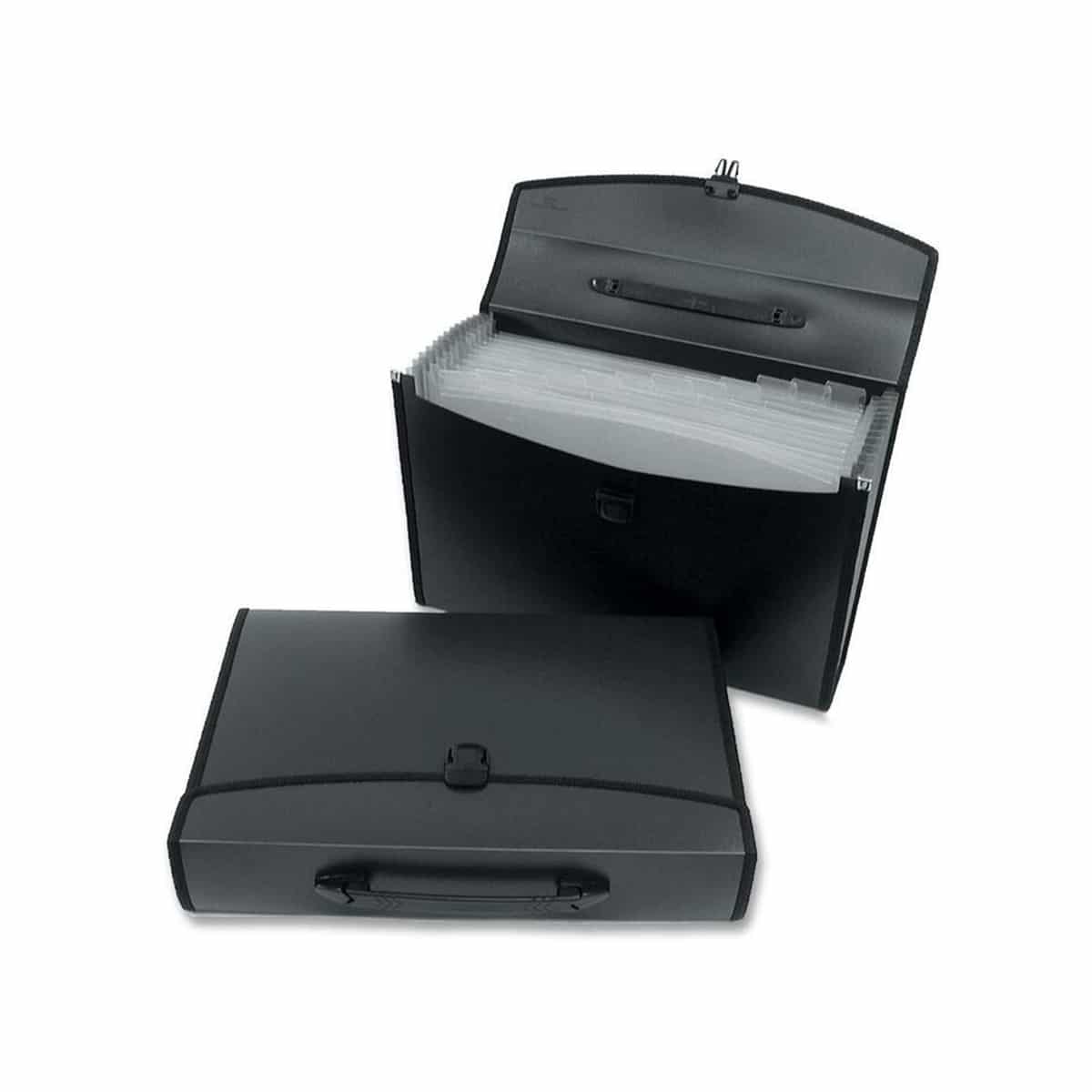 Polypropylène. Inclut insertions pour onglets. Poignée et fermoir. Format légal. 13 pochettes noir