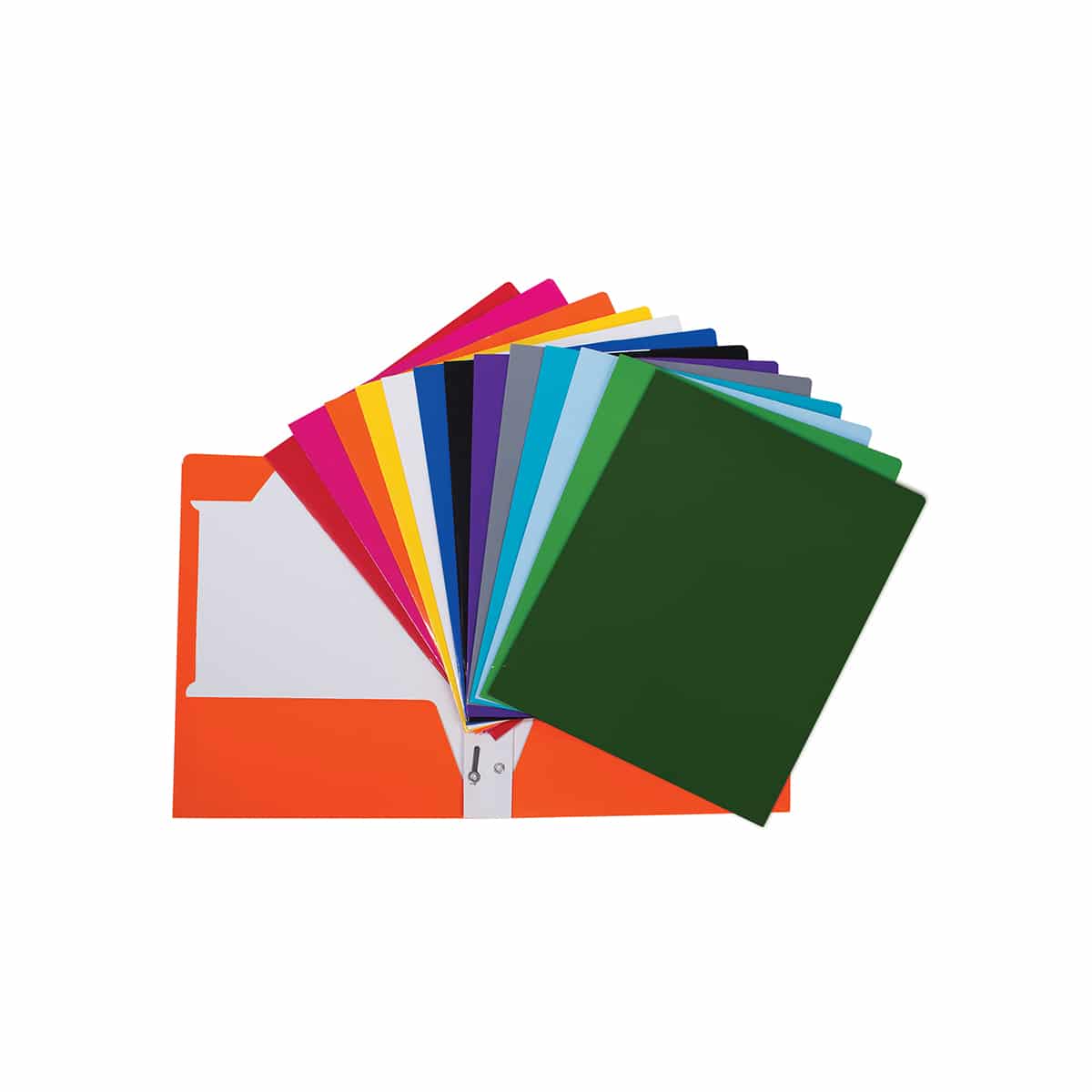 Carton laminé. 3 attaches. 2 pochettes intérieures. Capacité de 80 feuilles. Format lettre.