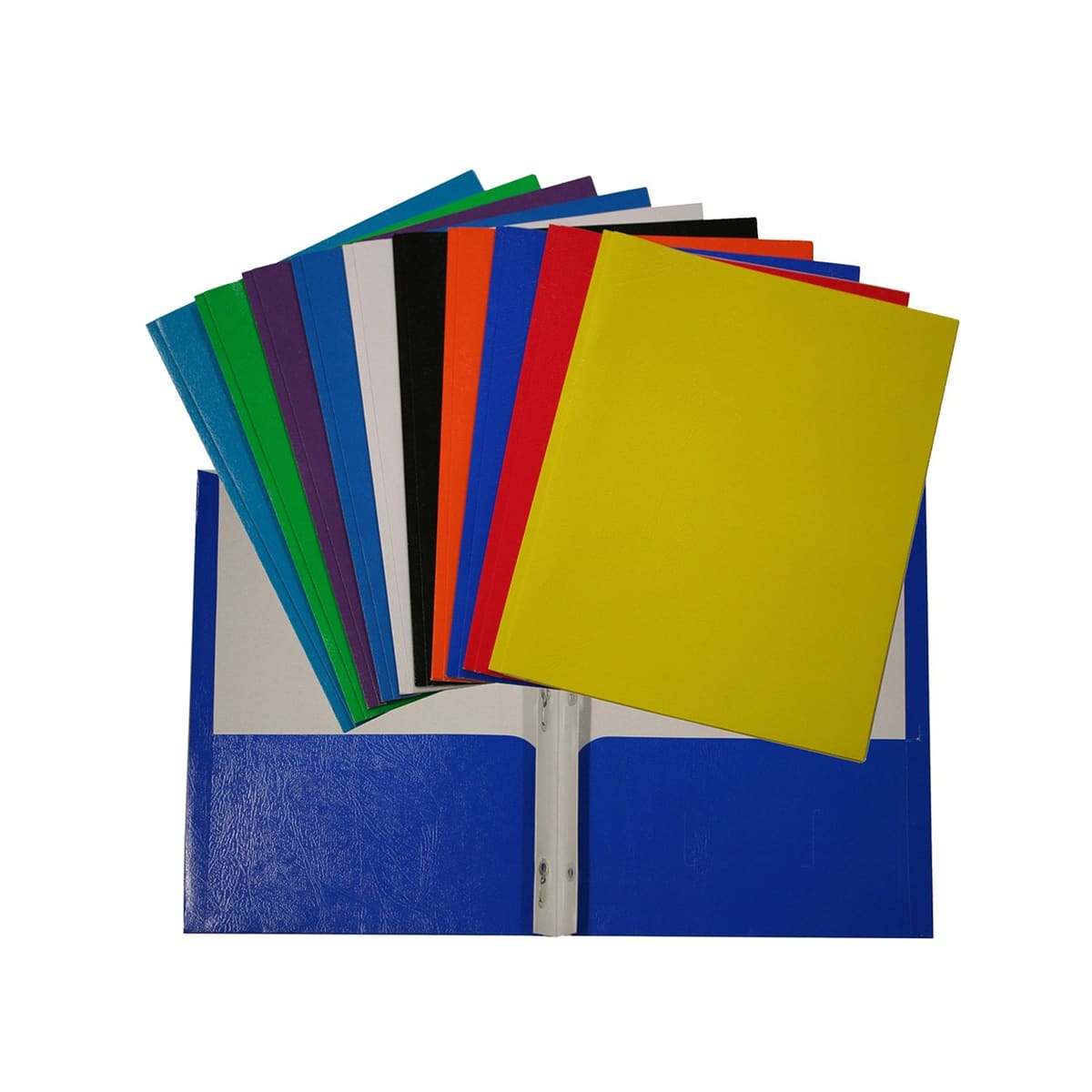 Texture brillante. 2 pochettes. 3 attaches. Porte-cartes professionnelles. Format lettre. Couleurs variées (Spécifier la couleur désirée dans les notes de commande, auquel cas une couleur au hasard vous sera envoyée).