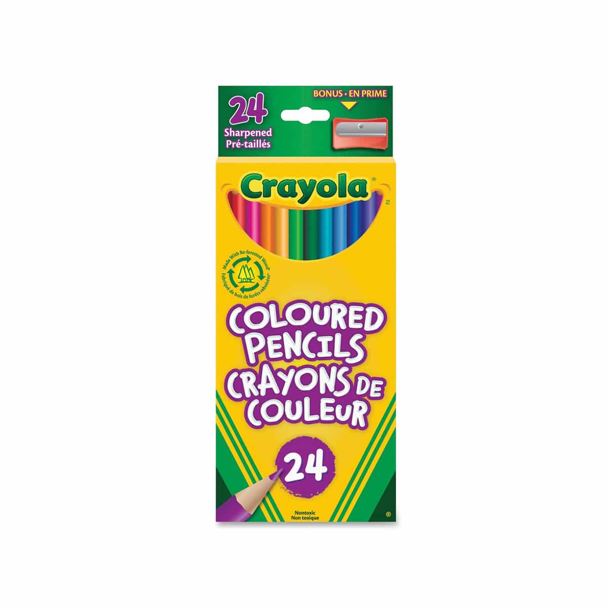 Prétaillés. Non-toxique. Couleurs variées. Boîte de 24 avec taille-crayon