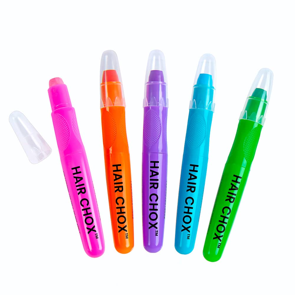 - 5 stylos-craies pour les cheveux (orange, rose, violet, bleu et vert).