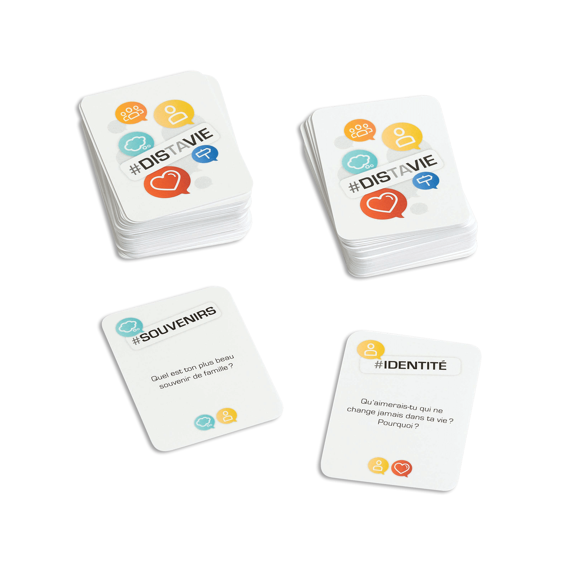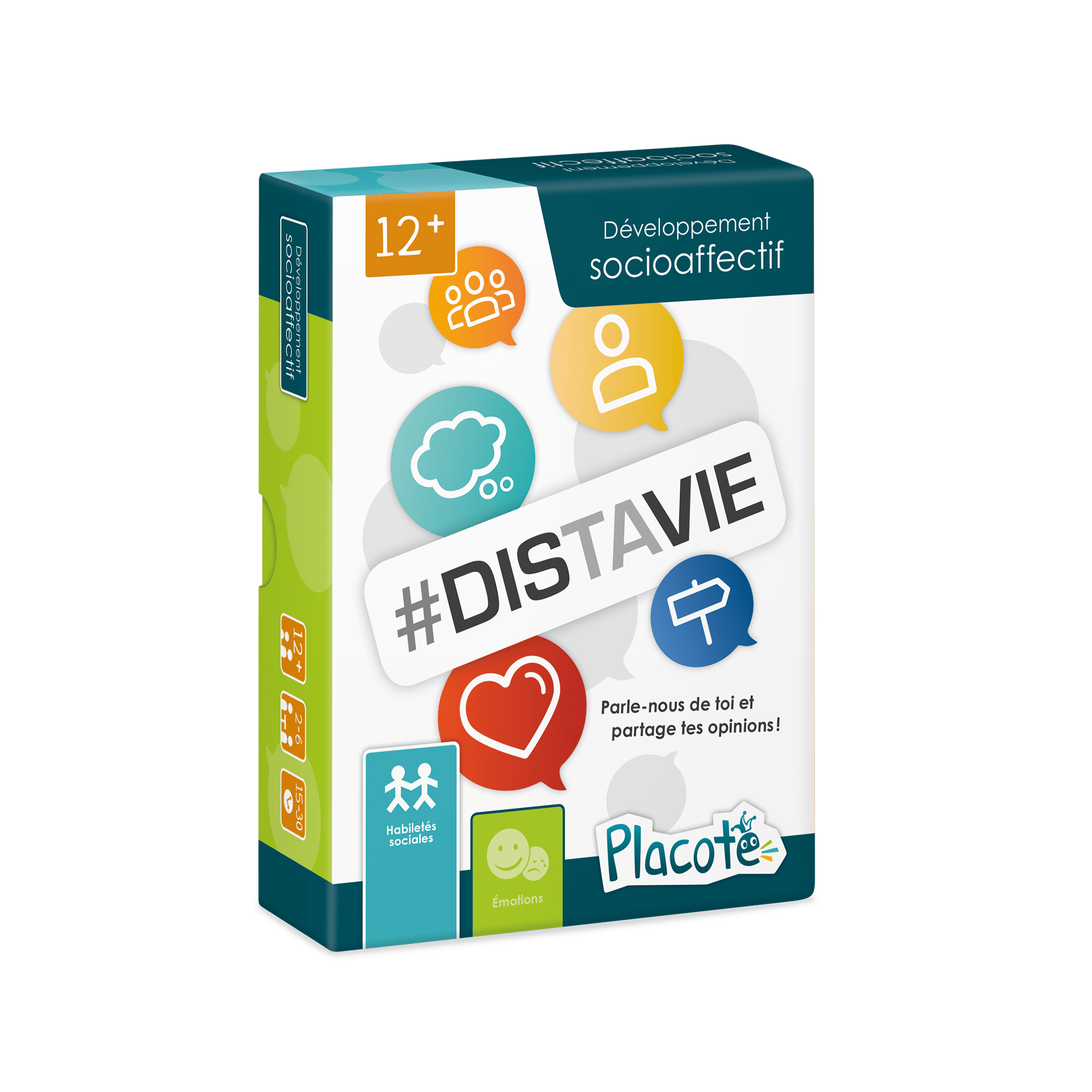 Quel est ton rêve le plus fou? Quel est ton meilleur souvenir de vacances? Débarrasse-toi le plus rapidement possible de tes cartes en répondant à des questions surprenantes! Avec un peu de chance, tu pourras t’esquiver grâce aux cartes spéciales!#Distavie permet aux adolescents de s’exprimer sur des sujets variés qui les concernent. Le jeu les amène ainsi à développer des habiletés sociales