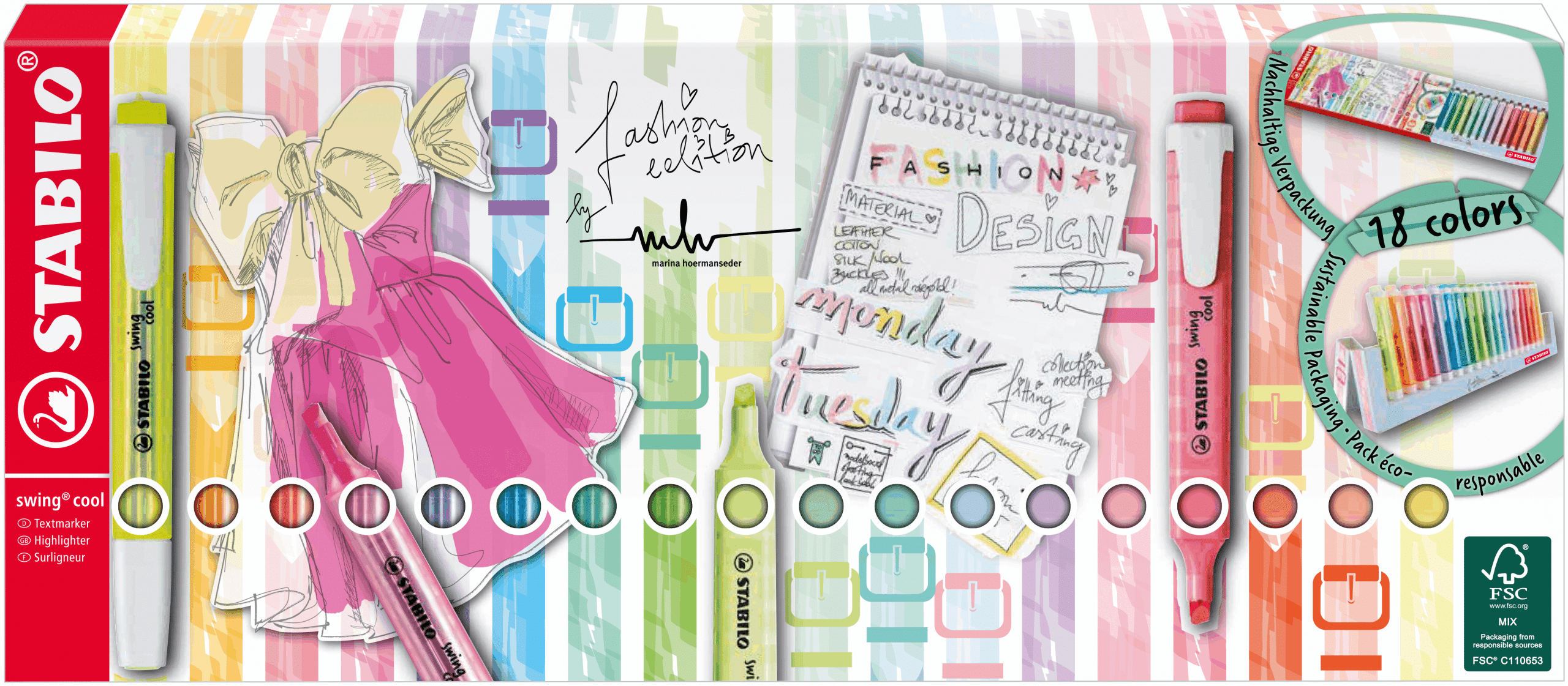 Retrouvez le pack de 18 surligneurs STABILO swing cool.