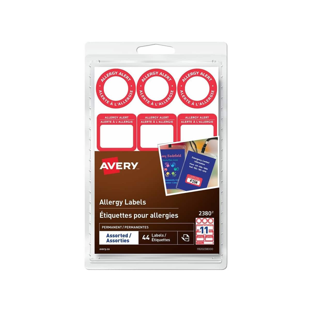Étiquettes inscriptibles de mise en garde contre les allergies Écriture manuscrite, dimensions variées, adhésif imperméable. Rouge.