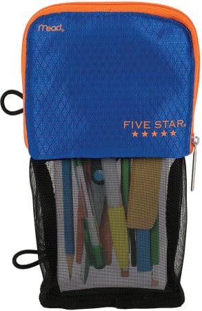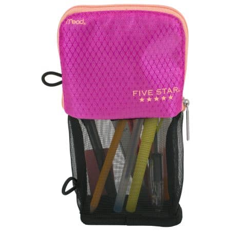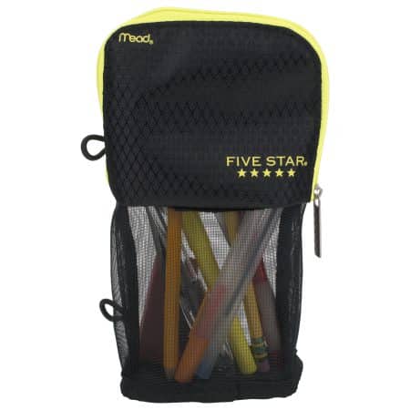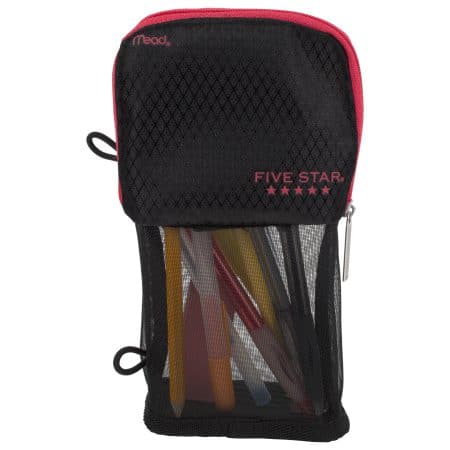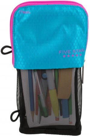 La trousse à crayons Five Star® est dotée d’un couvercle rabattable et d’une base plate permettant à la trousse de se poser facilement sur un bureau et d’accéder facilement aux fournitures. Les côtés en micro-maille résistants aux perforations permettent de voir le contenu.