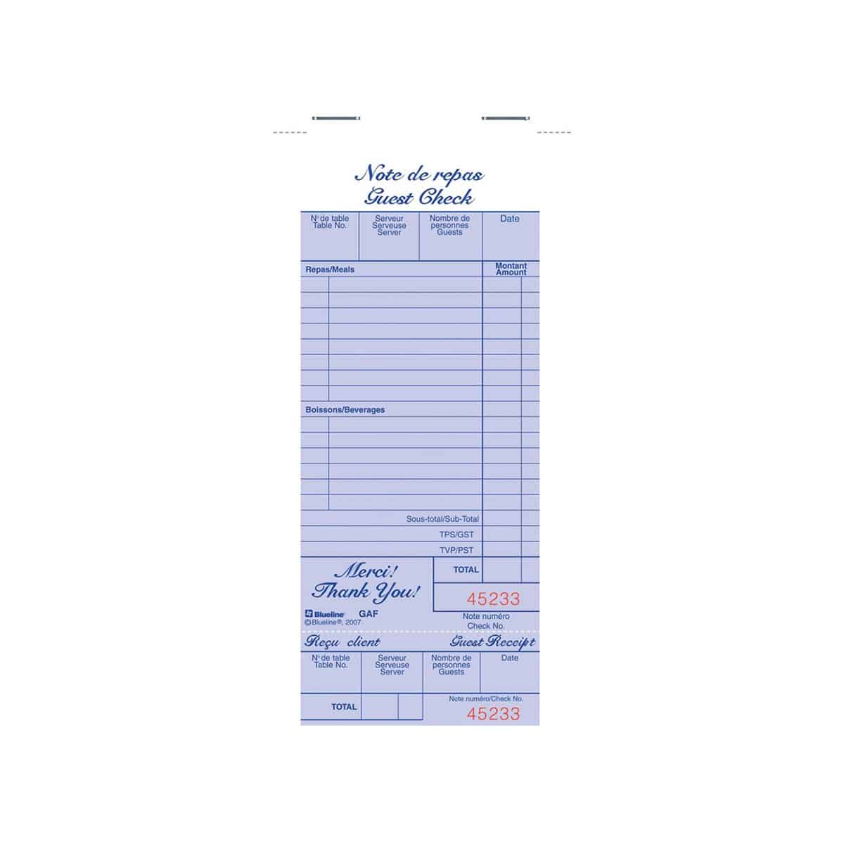 Factures numérotées. Tableau de taxes à l’endos. Livret de 100. 3-3/8 x 7-1/2″. 1 copie. Avec talon. bilingue
