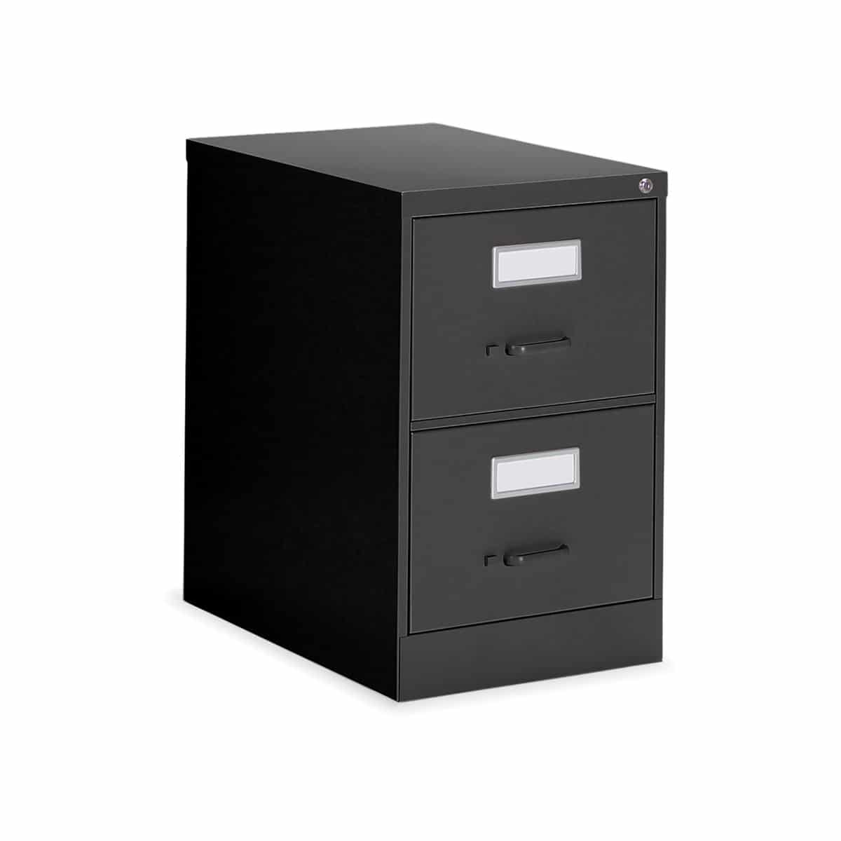 Poignées conventionnelles, avec loquet de sécurité. Côtés pleine hauteur, servant de supports pour dossiers suspendus. Plaque de compression mobile. Serrure. Largeur de 18 po. Profondeur de 26-9/16 po. 2 tiroirs. 29 po. H. noir