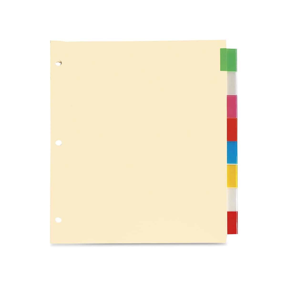 Onglets en plastique translucide avec insertions. Perforations renforcées de plastique. Chamois. Fibre postconsommation : 10 %. Lettre. 3 perforations. Couleurs variées. 8 onglets