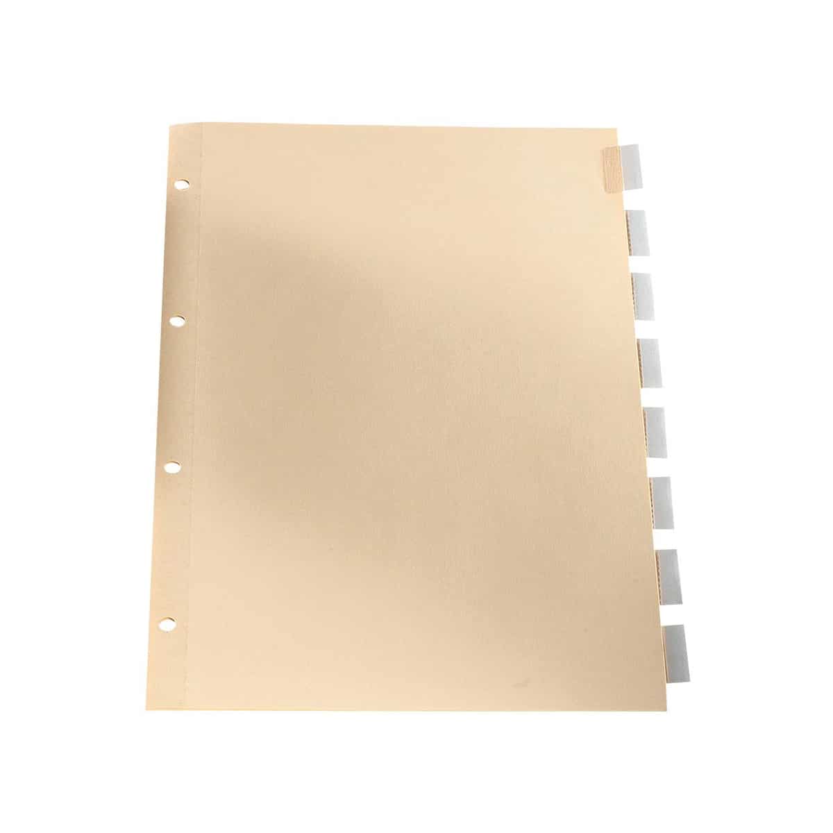 Onglets en plastique translucide avec insertions. Perforations renforcées de plastique. Chamois. Fibre postconsommation : 10 %. Légal. 4 perforations. Clair. 8 onglets