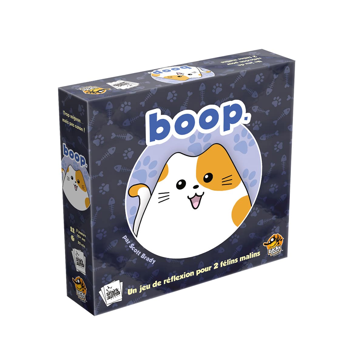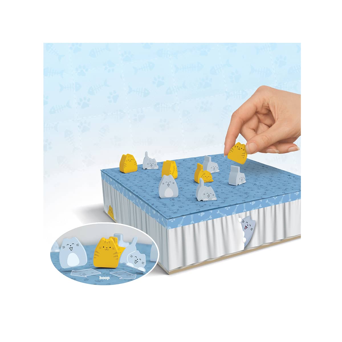 Un jeu de stratégie pour deux, aussi mignon qu’il est coton ! Dès que tu déposes un chaton sur le lit, il fait « boop ». Ce qui signifie qu’il repousse d’une case tous les chatons qui se trouvent à côté de lui. Aligne trois chatons pour les transformer en chats… et aligne trois chats pour gagner. Mais ça n’a rien de facile, puisque tes adversaires et toi passez votre temps à « booper » des chatons dans tous les sens : ils n’en font qu’à leur tête ! Parviendras-tu à « booper » tes chats pour décrocher la victoire ou te feras-tu éjecter du lit ?