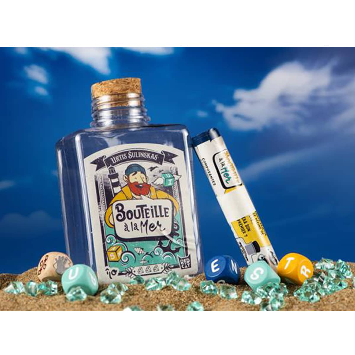 Une bouteille contenant une lettre a été rejetée sur le rivage par une vague géante. Relevez le défi de décrypter son mystérieux message ! BUT DU JEU Soyez le premier joueur à trouver un mot qui contient toutes les lettres affichées par les dés dans la bouteille. Un mot correctement trouvé vous rapporte 1 diamant. Le premier joueur à récolter 8 diamants remporte la partie. COMMENT JOUER Secouez la bouteille contenant les quatre dés-lettres, puis placez-la au centre de la table, bien en vue de tous les joueurs. La manche commence immédiatement : observez les lettres affichées par les dés et soyez le premier à dire un mot qui contient toutes les lettres ! Si votre mot est correct, prenez 1 diamant.