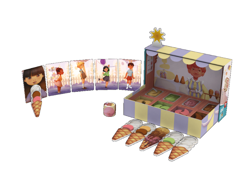 Qu’il fait chaud aujourd’hui! Caramel, fraise, vanille ou pistache, distribuez vos cornets de glace aux enfants de la fête foraine. Mais ne trainez pas, le soleil pourrait faire fondre vos belles créations! Carla Caramel est un jeu coopératif où il faudra aider la marchande de glaces à satisfaire les enfants qui font la queue devant son stand. Pour cela, distribuez 1 cornet de glace à chacun d’eux ! Mais attention à ce que le Soleil ne fasse pas fondre vos précieuses créations. • Un jeu coopératif dans le même univers que Monsieur Carrousel • Un somptueux matériel au service d’une mécanique accessible • Un jeu également jouable en solo