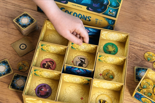 Dans Cocoons, vous devez coopérer pour libérer les gardiens égarés dans la boîte, puis les replacer dans leurs cocons respectifs. À votre tour, dépensez un jeton d’action pour faire glisser un cocon, comme dans un jeu de taquin, et révéler ainsi de nouvelles informations : chaque joueur ne voit que les indices en face de lui, et il faut donc bien communiquer entre vous pour identifier les cocons ! Si vous dévoilez une trappe au fond de la boîte, ouvrez-la pour activer son effet et découvrir l’animal gardien caché dessous. Vous pouvez désormais déplacer ce gardien dans son cocon, si vous l’avez déjà localisé. Une fois que tous les gardiens ont rejoint leur cocon, retrouvez le jeton de départ pour sceller votre victoire. Mais attention : vous devez y parvenir avant d’arriver à court d’actions ! Au fil de vos parties, ajoutez de nouvelles trappes pour des défis de plus en plus relevés !