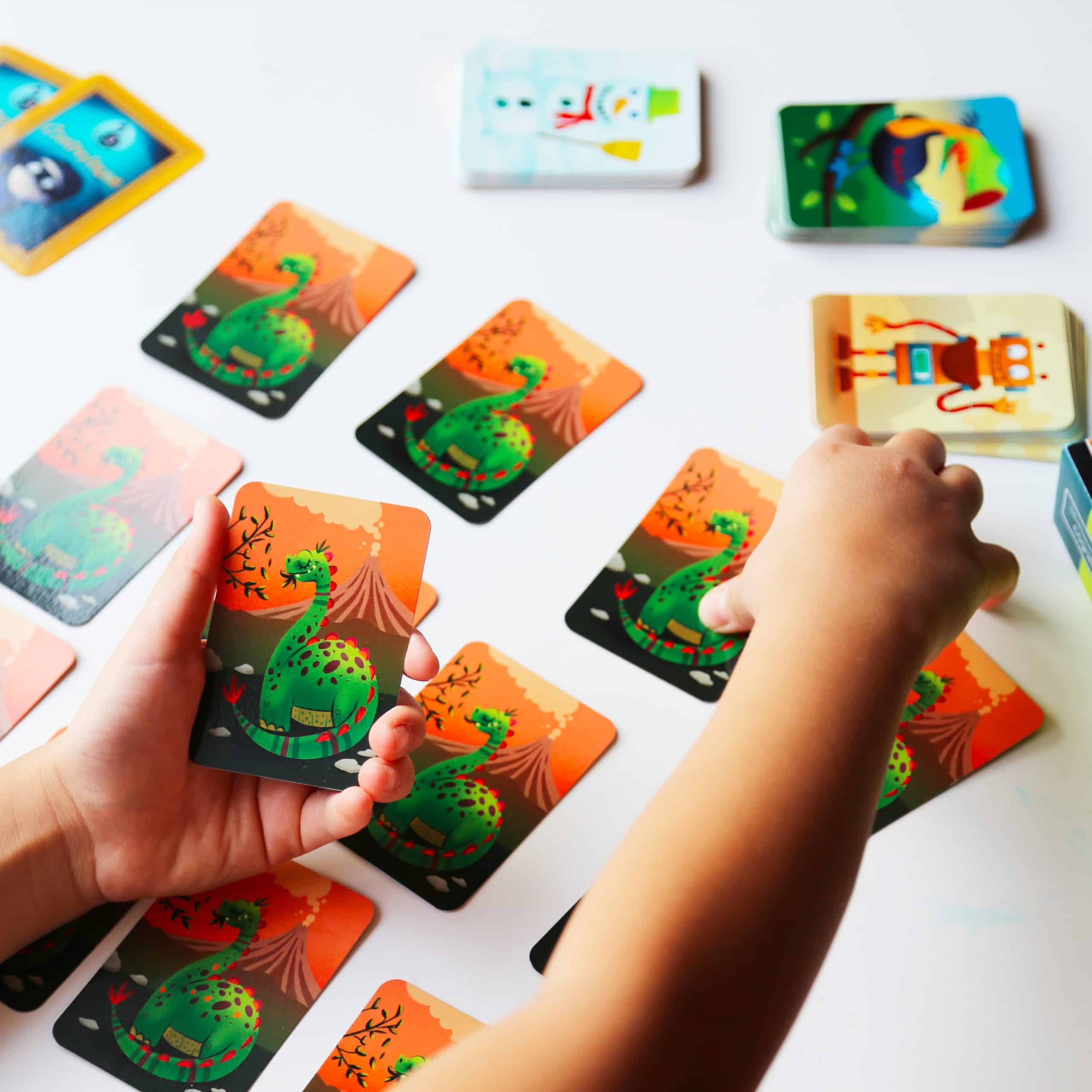 Le jeu comprend 84 cartes et propose quatre niveaux de difficulté avec des différences de plus en plus subtiles entre les images. La comparaison d’images sollicite également un engagement de la mémoire à court terme chez l’enfant. En effet, pour devenir habile dans le jeu, le joueur gagne à mémoriser les caractéristiques qui distinguent les images afin d’orienter sa recherche. Cette particularité du jeu le distingue d’ailleurs d’un jeu plus classique de recherche visuelle et le rend un peu plus difficile que le jeu Placote Chasseurs en herbe.