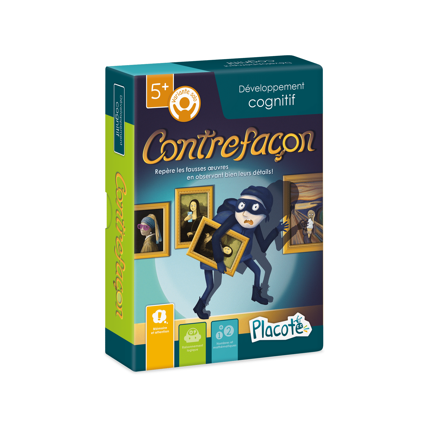 Contrefaçon est un jeu conçu pour aider les enfants de 5 à 10 ans à développer des habiletés d’attention sélective et de discrimination visuelle. Les joueurs observent une série d’images qui comportent de légères différences entre elles. Ils doivent trouver le plus rapidement possible la carte identique à celle retournée sur une pile en vue de remporter cette dernière. Les différents niveaux proposés en font un jeu évolutif adapté aux capacités de chaque enfant