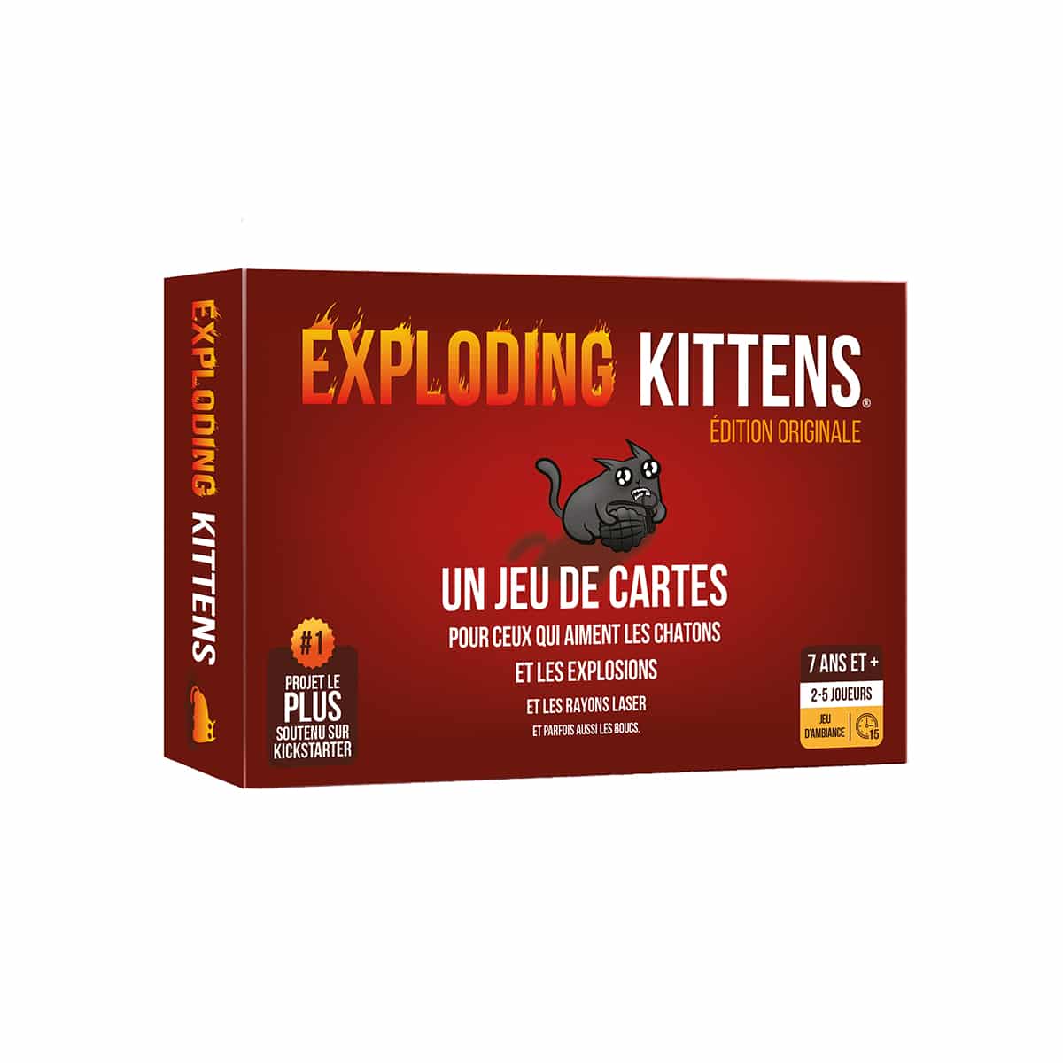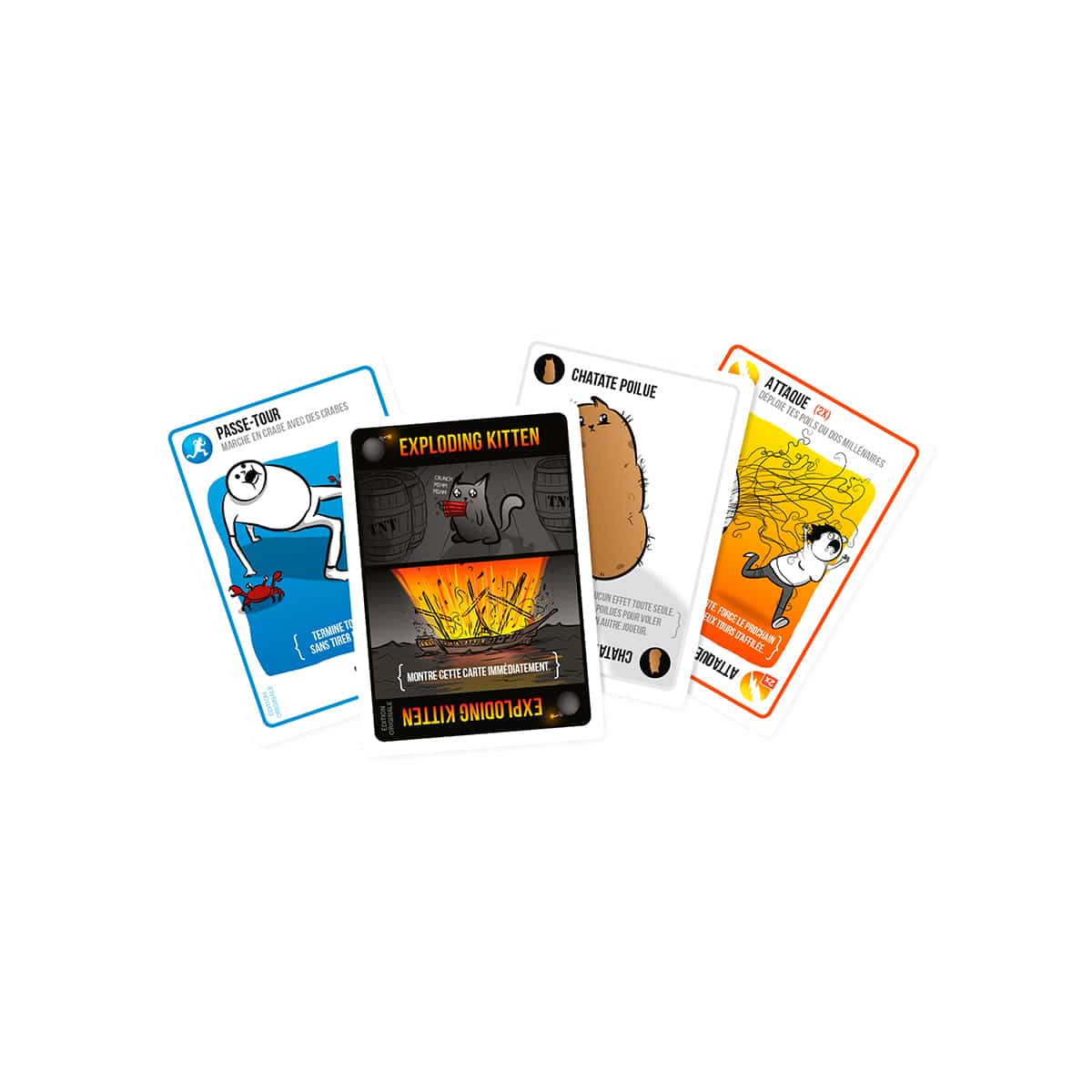 Exploding Kittens est une version “cat-power” hautement stratégique de la roulette russe. Tirez des cartes jusqu’à ce que quelqu’un pioche un Chaton Explosif et soit éliminé. À moins qu’il n’utilise un Kit de Désamorçage, qui neutralise le chaton à l’aide de pointeurs laser ou de sandwichs à l’herbe à chat. Toutes les autres cartes servent à déplacer, modérer ou éviter les bombes.