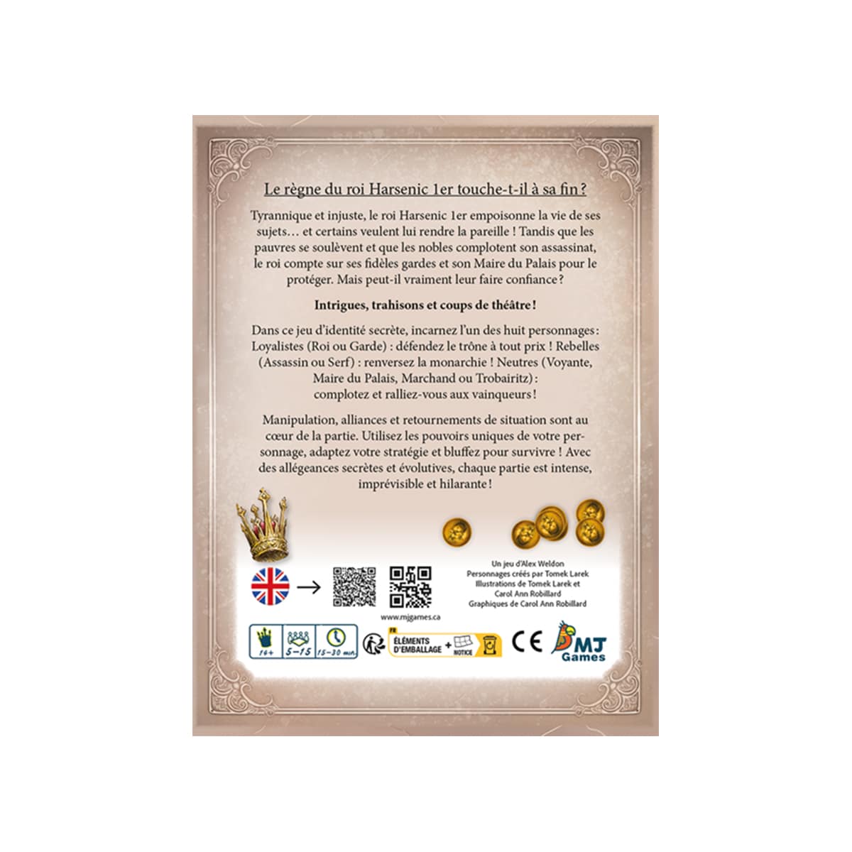 Le règne du roi Harsenic 1er touche-t-il à sa fin ? Tyrannique et injuste, le roi Harsenic 1er empoisonne la vie de ses sujets… et certains veulent lui rendre la pareille ! Tandis que les pauvres se soulèvent et que les nobles complotent son assassinat, le Roi compte sur ses fidèles gardes et son bailli pour le protéger. Mais peut-il vraiment leur faire confiance ? Intrigues, trahisons et coups de théâtre ! Dans ce jeu d’identité secrète, incarnez l’un des huit personnages: • Loyaliste (Roi ou Garde) : défendez le trône à tout prix ! • Rebelle (Assassin ou Serf) : renversez la monarchie ! • Neutre (Voyante, Trafiquant, Bailli ou Trobairitz) : complotez et ralliez-vous aux vainqueurs ! Manipulation, alliances et retournements de situation sont au cœur de la partie. Utilisez les pouvoirs uniques de votre personnage, adaptez votre stratégie et bluffez pour survivre ! Avec des allégeances secrètes et évolutives, chaque partie est intense, imprévisible et hilarante !