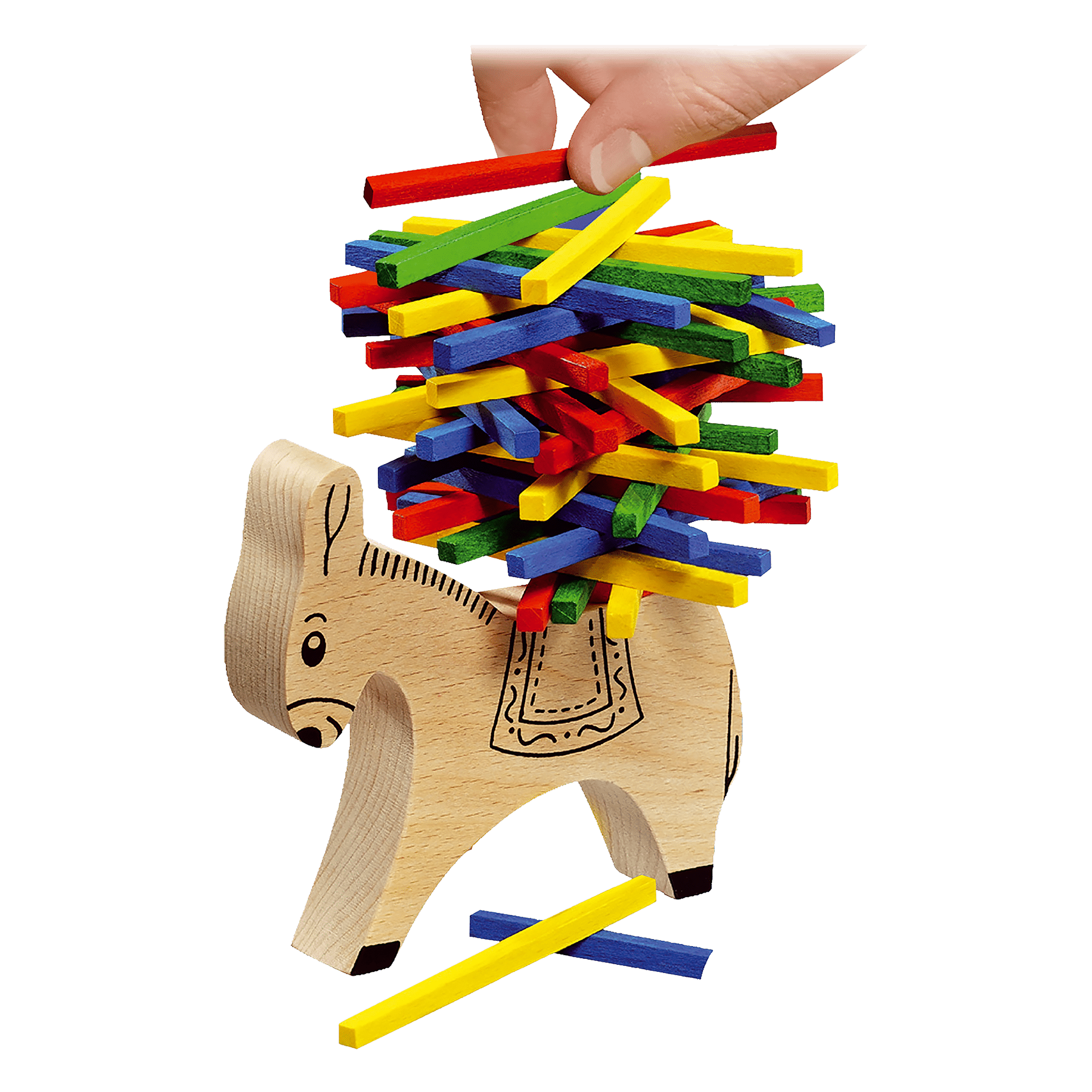 Quand le petit âne de bois n’en peut plus de porter toutes ces buchettes de couleur, ii se cabre et les jette parterre. Celui qui dott toutes les prendre n’a vraiment pas de veine.