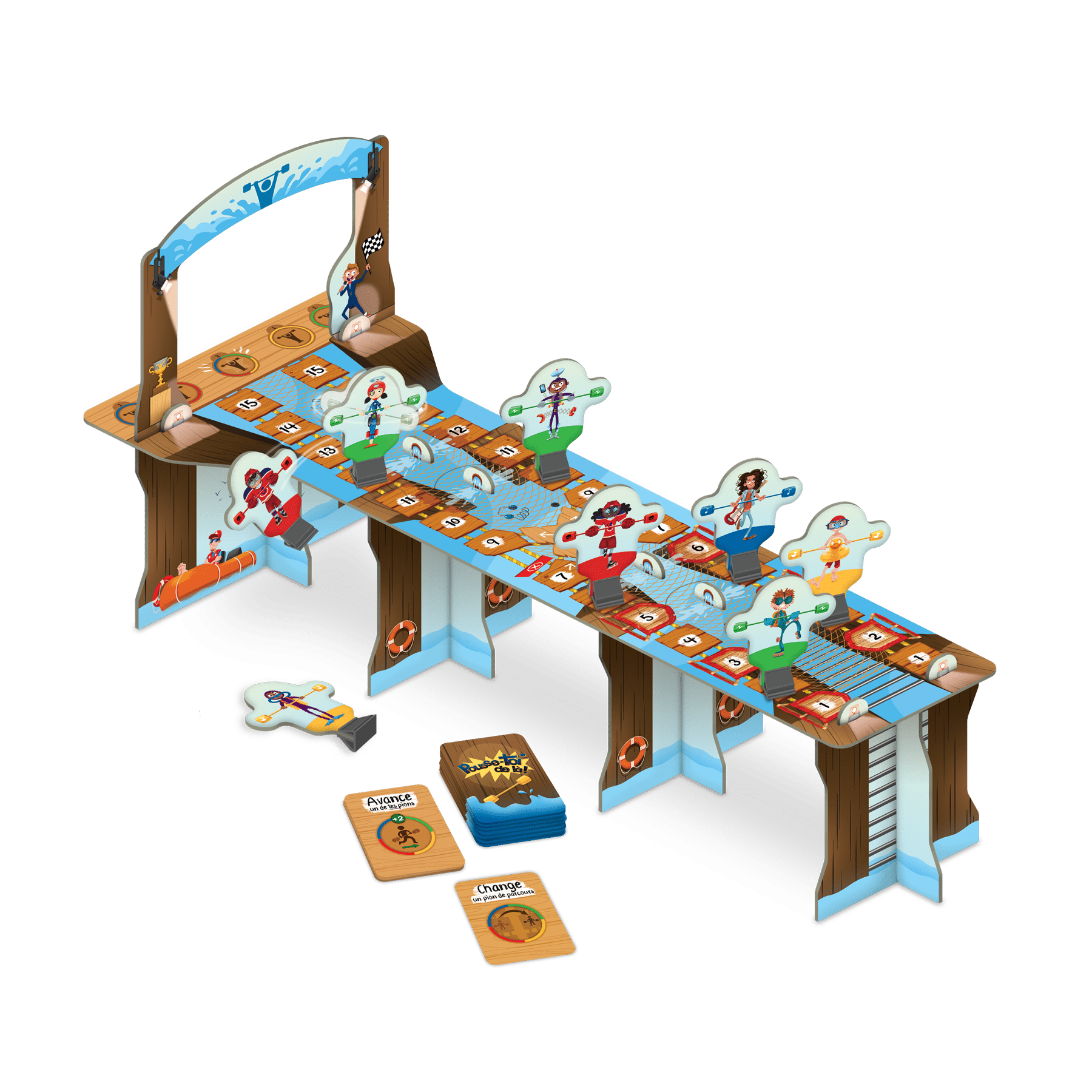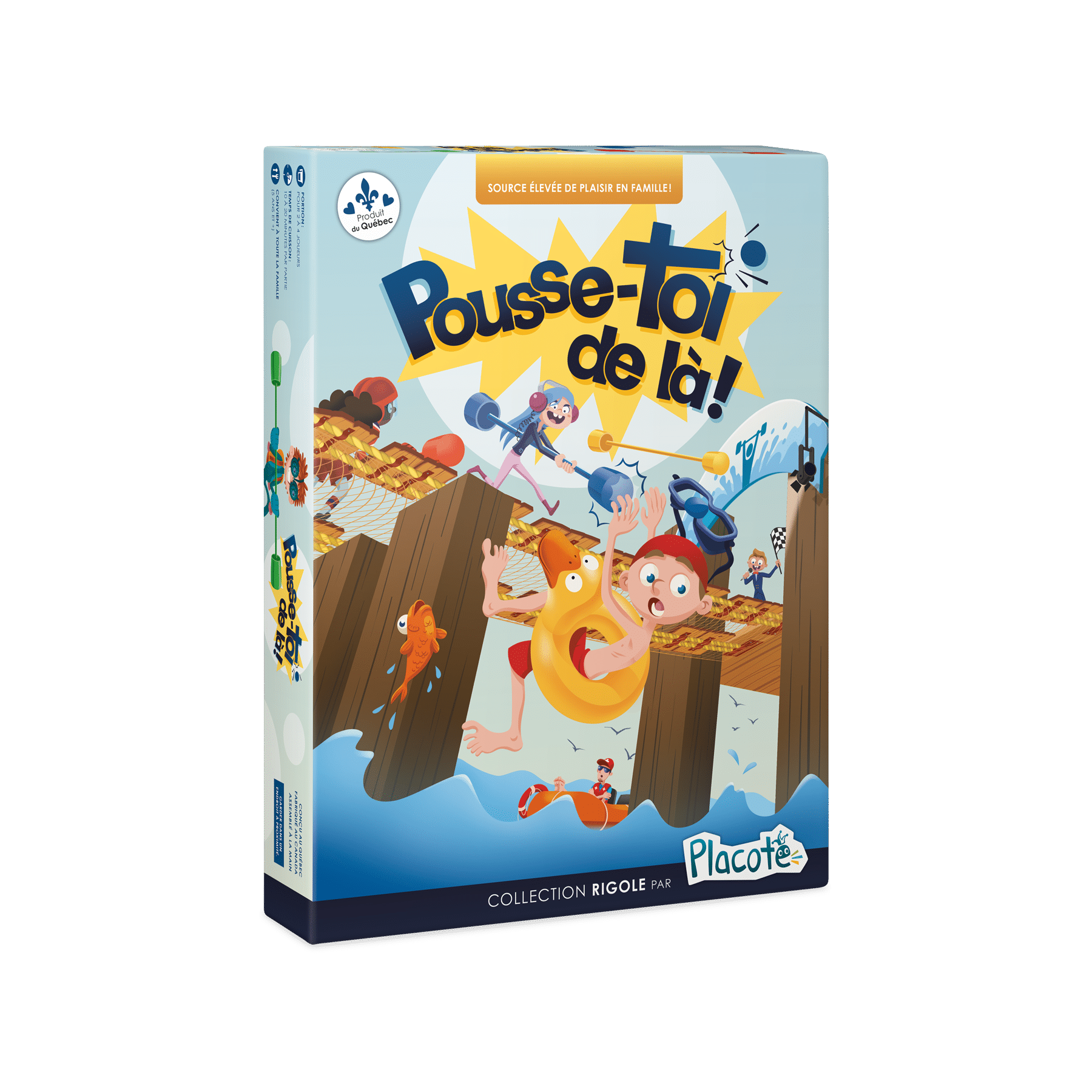 Pousse-toi de là! est un jeu de parcours familial dans lequel les joueurs s’affrontent dans une course en hauteur. Les joueurs tournent des cartes-actions qui font par exemple avancer un de leurs pions, reculer le pion d’un adversaire ou changer un pion de parcours. Chaque fois qu’un pion arrive sur la même case que le pion d’un adversaire ou en dépasse un, le joueur pousse le pion adverse en bas du plateau de jeu (il le «pousse à l’eau»!). Le joueur qui parvient à amener deux de ses pions à l’arrivée en premier remporte la partie. Êtes-vous prêts à prendre part à cette course rocambolesque?