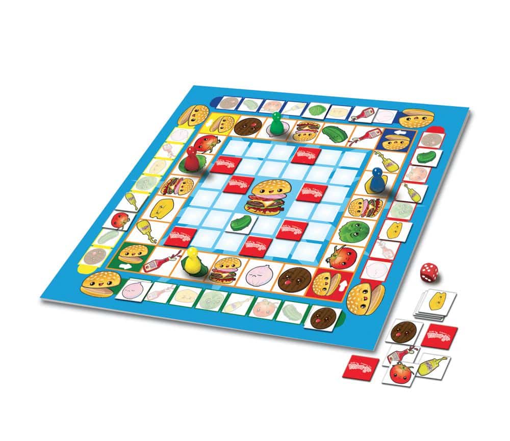 Dans le jeu Prépare ton hamburger, les joueurs rassemblent les cartes d’ingrédients sur le plateau de jeu, espérant être les premiers à compléter un hamburger. Quiconque collecte en premier 8 cartes d’ingrédients complète son hamburger et gagne la partie!