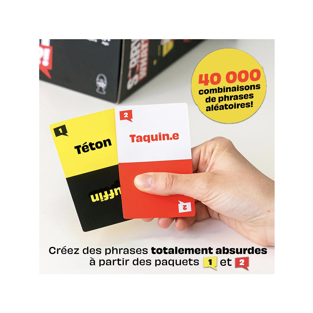 DES RÉPONSES IMPROBABLES ET HILARANTES – Avec 100 cartes-mots aléatoires et plus de 40 000 combinaisons possibles, chaque partie est remplie de phrases inattendues qui feront rire tout le monde aux éclats!