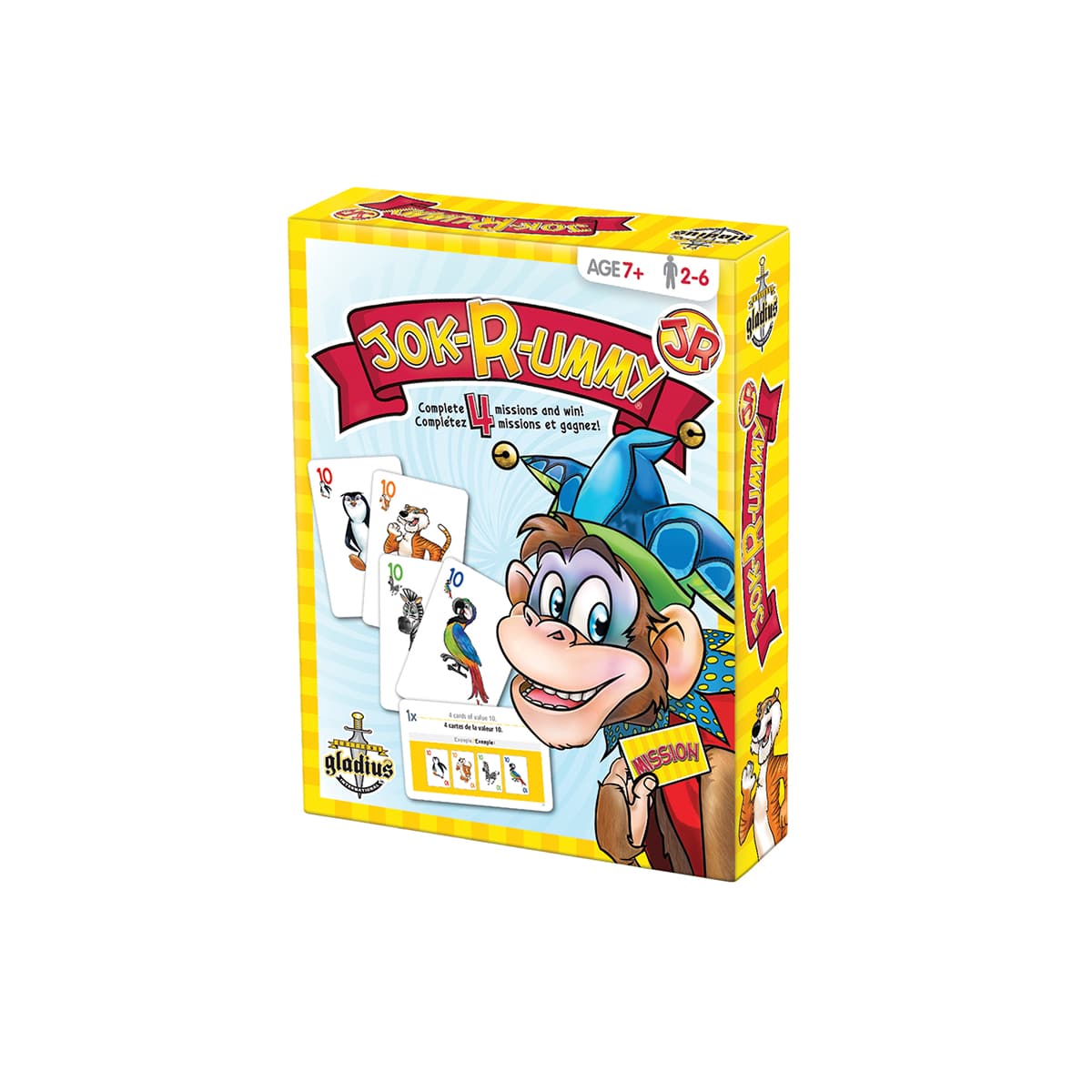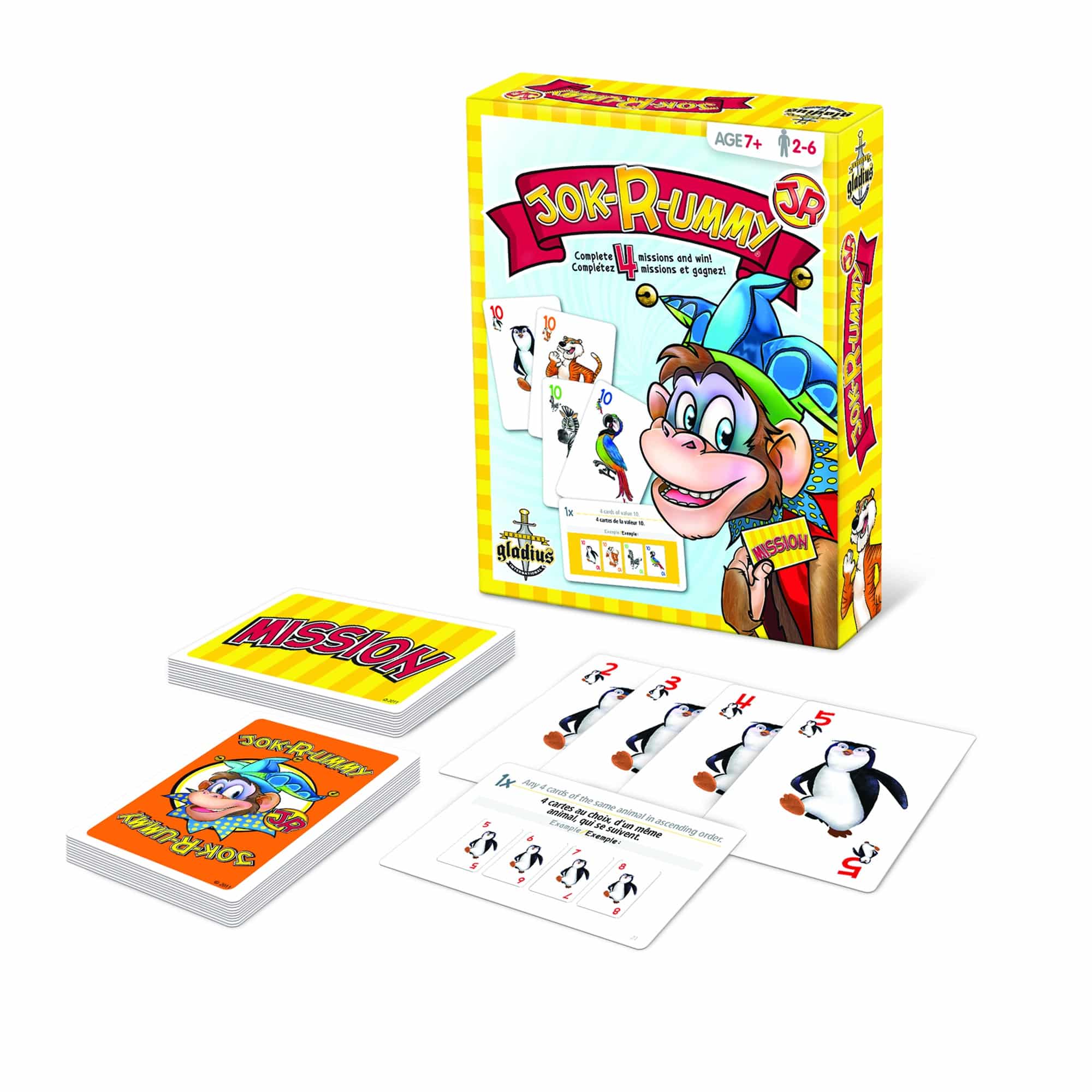 Les enfants (ainsi que les grands) prendront plaisir à jouer à cette adaptation du populaire et classique jeu Jok-R-ummy®. Faites équipe avec Perroquet, Pingouin, Tigre et Zèbre pour accomplir vos missions. Servez-vous judicieusement des cartes Singe pour parvenir à vos fins et faites attention aux cartes que vous jouez, car elles pourraient bien avantager vos adversaires… Soyez le premier à effectuer vos 4 missions et vous serez le grand gagnant de l’aventure Jok-R-ummy jr®.