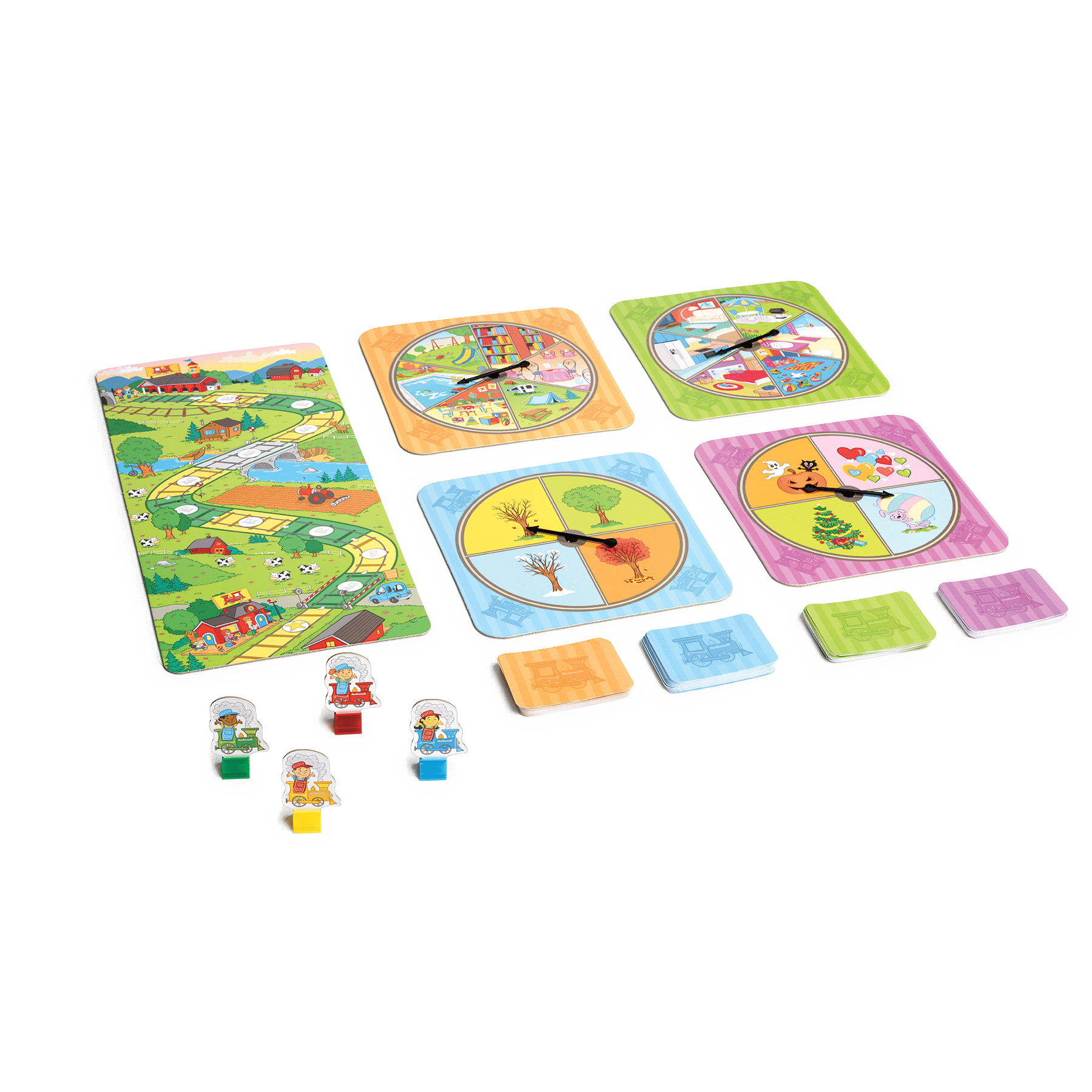 Es-tu prêt à aller à la prochaine gare? Pour y arriver, tu dois faire tourner les roues de ta locomotive et allonger tes phrases. Arriveras-tu en premier? Le train des phrases est conçu pour aider les enfants de3à 5 ans à faire des phrases plus longues. Les roulettes de lieux et de temps permettent aux enfants d’ajouter un complément aux phrases illustrées sur les cartes-images. Les phrases ainsi obtenues sont parfois réalistes, parfois farfelues, ce qui ajoute un aspect amusant au jeu.