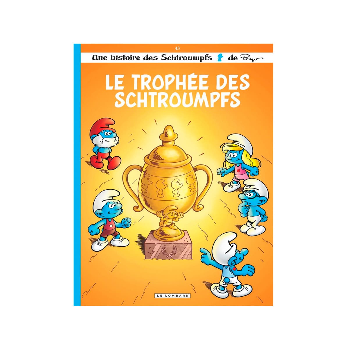 Les Schtroumpfs . Tome 43 : Le Trophée des Schtroumpfs . Que ce soit pour une passe de ballon au football ou pour accompagner le Grand Schtroumpf à la cueillette d’aigremoine, le Schtroumpf Discret n’est jamais sélectionné nulle part. Il y en a toujours pour les mêmes, y compris le Schtroumpf Costaud ! Las de passer inaperçu, il s’en va cueillir la plante en solitaire afin de montrer de quel bois il se schtroumpfe ! Malheureusement pour lui, son escapade se ne se passe pas tout à fait comme prévu : il se schtroumpfe de plante et se fait attraper par une Anemonus Schtroumpfaë ! Sauvé par le Schtroumpf Costaud (décidément…), l’incident ne lui permet pas de se mettre en avant, mais rappelle néanmoins au Grand Schtroumpf la tenue d’un événement important : le Trophée des Schtroumpfs ! Cette compétition est exactement ce qu’il faut au Schtroumpf Discret pour être enfin reconnu à sa juste valeur, c’est le moment pour lui de tenter sa chance ! Mais la route est semée d’embûches et la concurrence est rude. Parviendra-t-il à devenir le Champion des Schtroumpfs ? . Une compétition schtroumpfante, pleine d’heureux hasards et de stratagèmes en tous genres pour se démarquer ! Car qui n’a jamais voulu se faire remarquer, à un moment de sa vie ? Assez de l’ombre, l’on veut rayonner à la lumière du jour ! Mais concourir est-il réellement le meilleur moyen pour ce faire ? Les intérêts individuels doivent-ils nécessairement primer sur le collectif pour atteindre ses objectifs ? Ne finit-on pas simplement par devenir individualiste ? Et si, finalement, la solution pour briller était l’entraide ? Un album schtroumpfant, sportif et riche en épreuves toutes plus originales les unes que les autres ! De quoi être franchement schtroumpfé !.