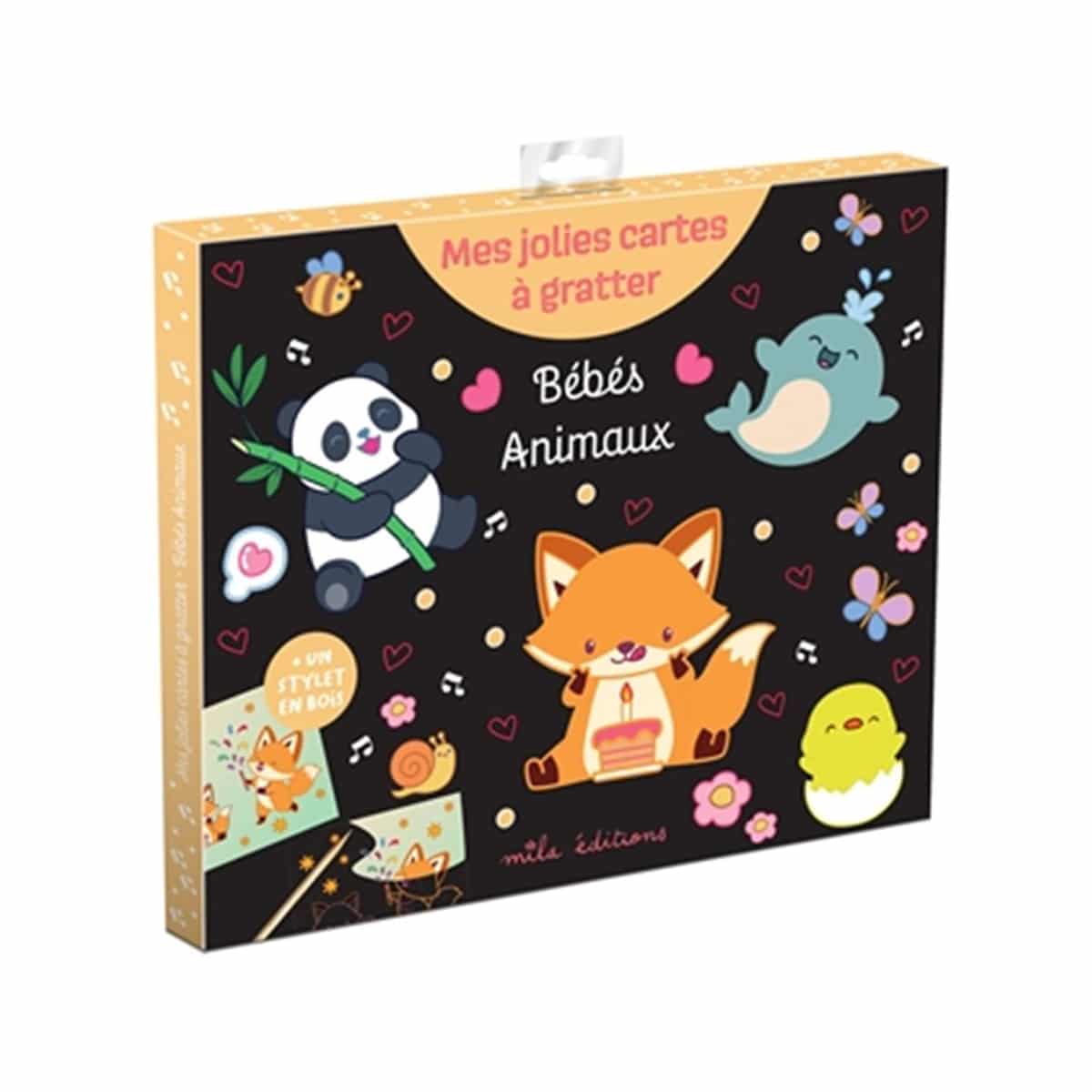 Mes jolies cartes à gratter . Bébés Animaux . Plonge dans un univers tout doux rempli de bébés animaux avec ce kit contenant 8 cartes à gratter et un stylet en bois ! . Avec ton stylet, fais apparaître les illustrations cachées sous la surface noire pour révéler 8 adorables cartes mettant en scène de petites boules de poils toutes mignonnes. Que tu sois un fervent amateur d’animaux ou simplement à la recherche d’une activité apaisante, ces cartes promettent une expérience amusante et pleine de surprises !.