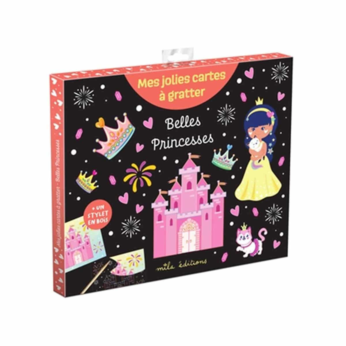 Mes jolies cartes à gratter . Belles Princesses . Plonge dans un univers de conte rempli de princesses avec ce kit contenant 8 cartes à gratter et un stylet en bois ! . Avec ton stylet, fais apparaître les illustrations cachées sous la surface noire pour révéler 8 adorables cartes mettant en scène de belles princesses. Que tu sois passionné de châteaux et belles robes ou simplement à la recherche d’une activité apaisante, ces cartes promettent une expérience amusante et pleine de surprises !.