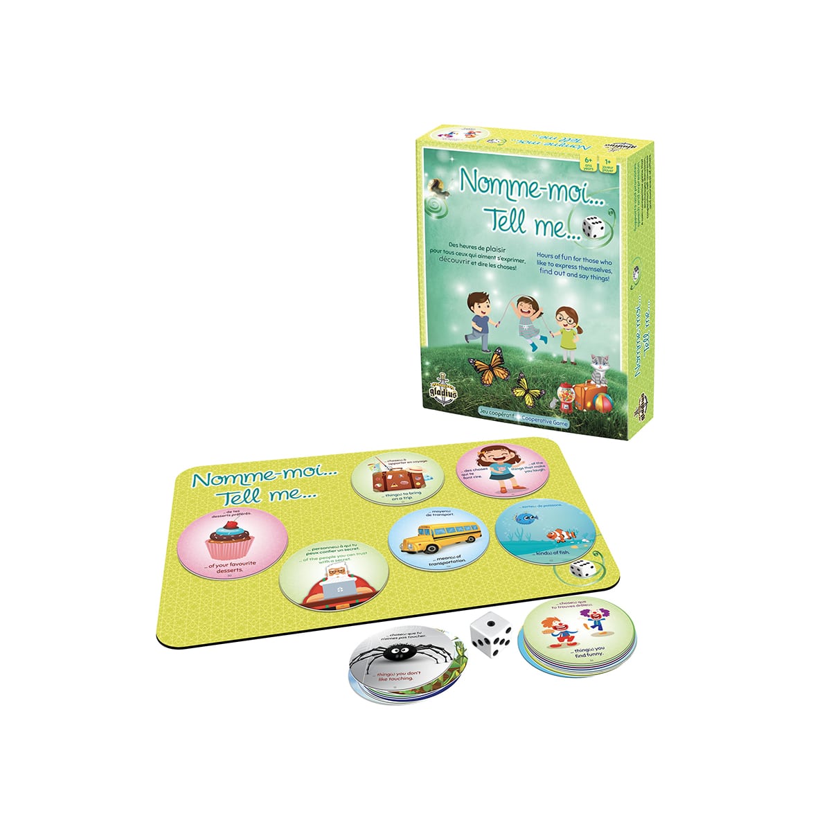 Nomme-moi… est un jeu qui vous fera vivre différentes émotions, du rire à la surprise, selon les réponses données par les joueurs, grâce aux multiples situations illustrées sur les pastilles de jeu. Tout en s’amusant, les enfants peuvent apprendre à s’interroger, à reconnaître leurs propres désirs, leurs préférences, leurs peurs, leurs inquiétudes, mais surtout à les exprimer. Ce jeu favorise également la communication et l’échange. Un jeu non compétitif où tous les enfants gagnent à y jouer. Il n’y a aucune mauvaise réponse, que des choses à exprimer, à entendre et à comprendre.