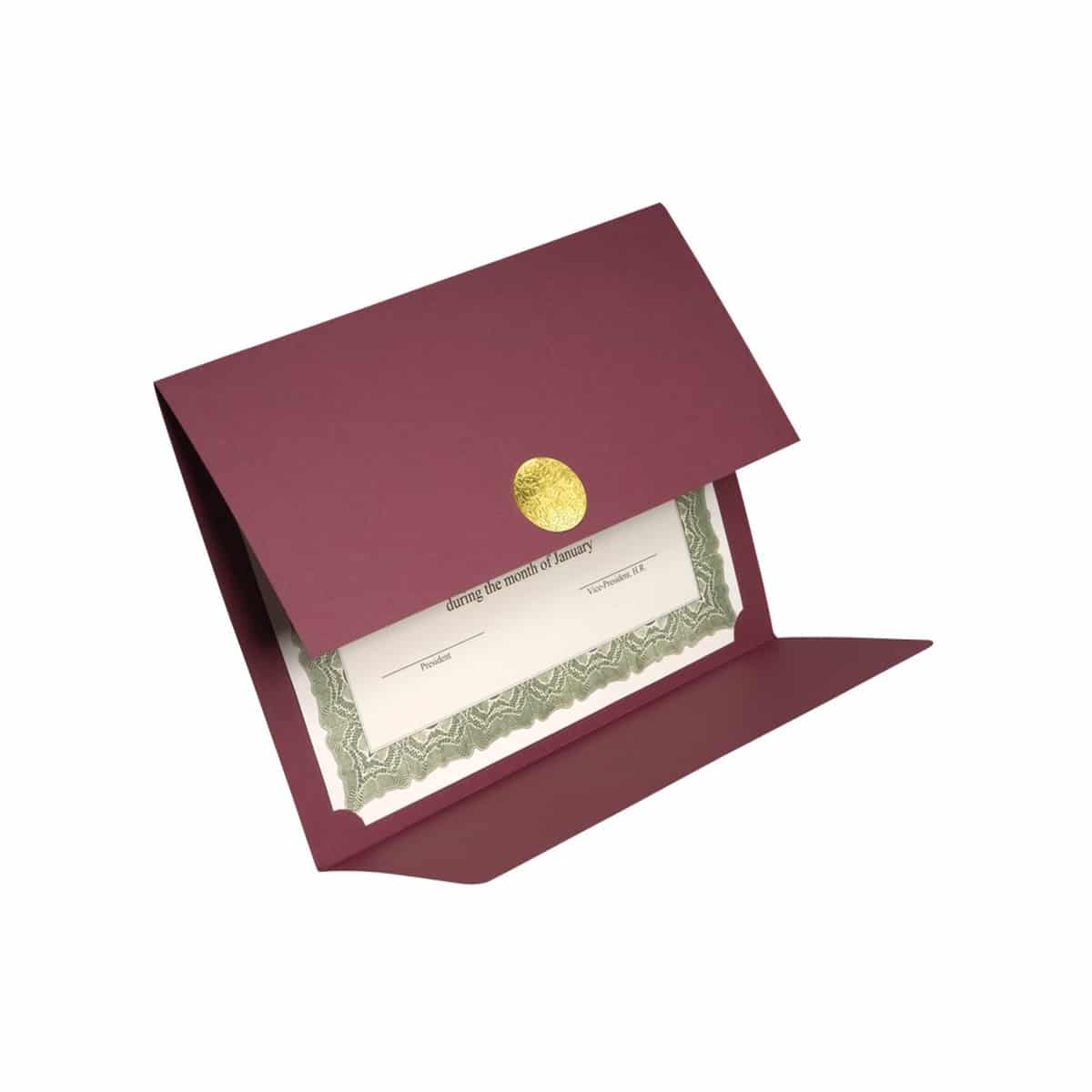Porte-certificat à double rabat. Fermeture par un médaillon métallisé embossé. Fini toile épais. Perforé pour l’insertion de documents de format lettre. Paquet de 5. Postconsommation : 30 %.