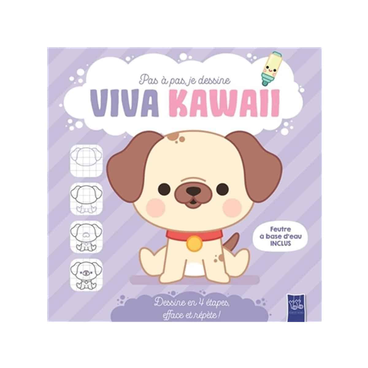 Viva kawaii . Bienvenue dans le monde du kawaii ! . Page effaçable pour dessiner. Instructions en quatre étapes. Feutre à base d’eau. Dessin à recopier. Page effaçable pour dessiner. Rêves-tu d’être un artiste célèbre ? Suis les instructions en quatre étapes et tu le deviendras ! De jolis dessins des figures kawaii n’attendent que toi pour être copiés. Sers-toi du feutre à base d’eau pour dessiner sur les pages dépliantes, puis efface tout et profite à nouveau du plaisir de dessiner !