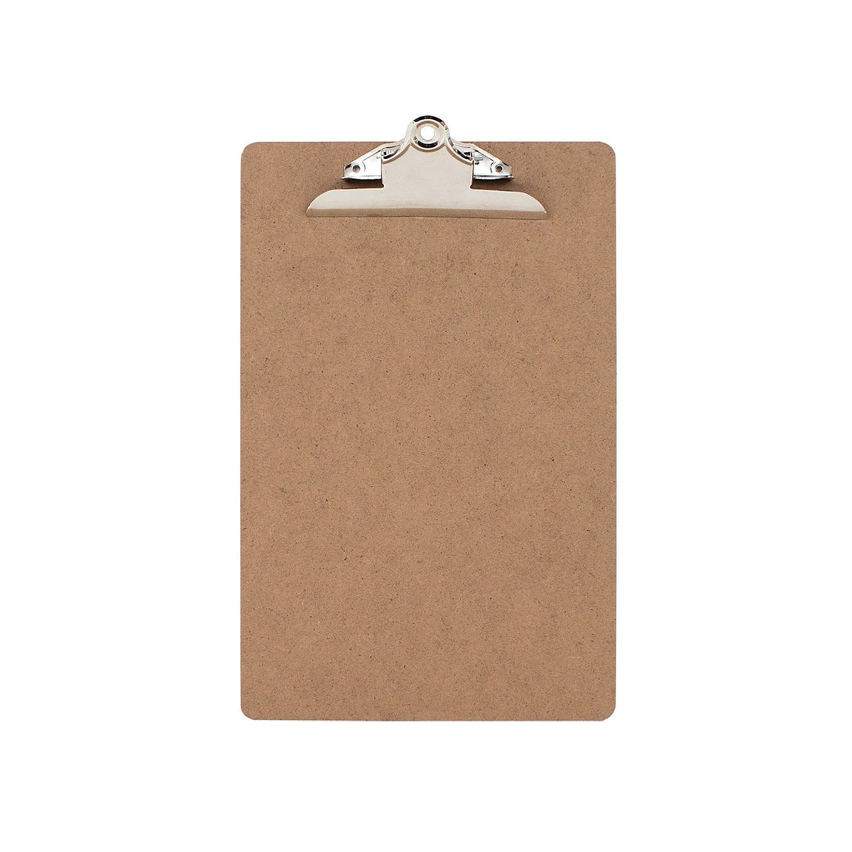 Aggloméré. Fini adouci sur les 2 côtés. Pince de 6 po de large plaquée en nickel. Masonite100 % recyclé. format légal