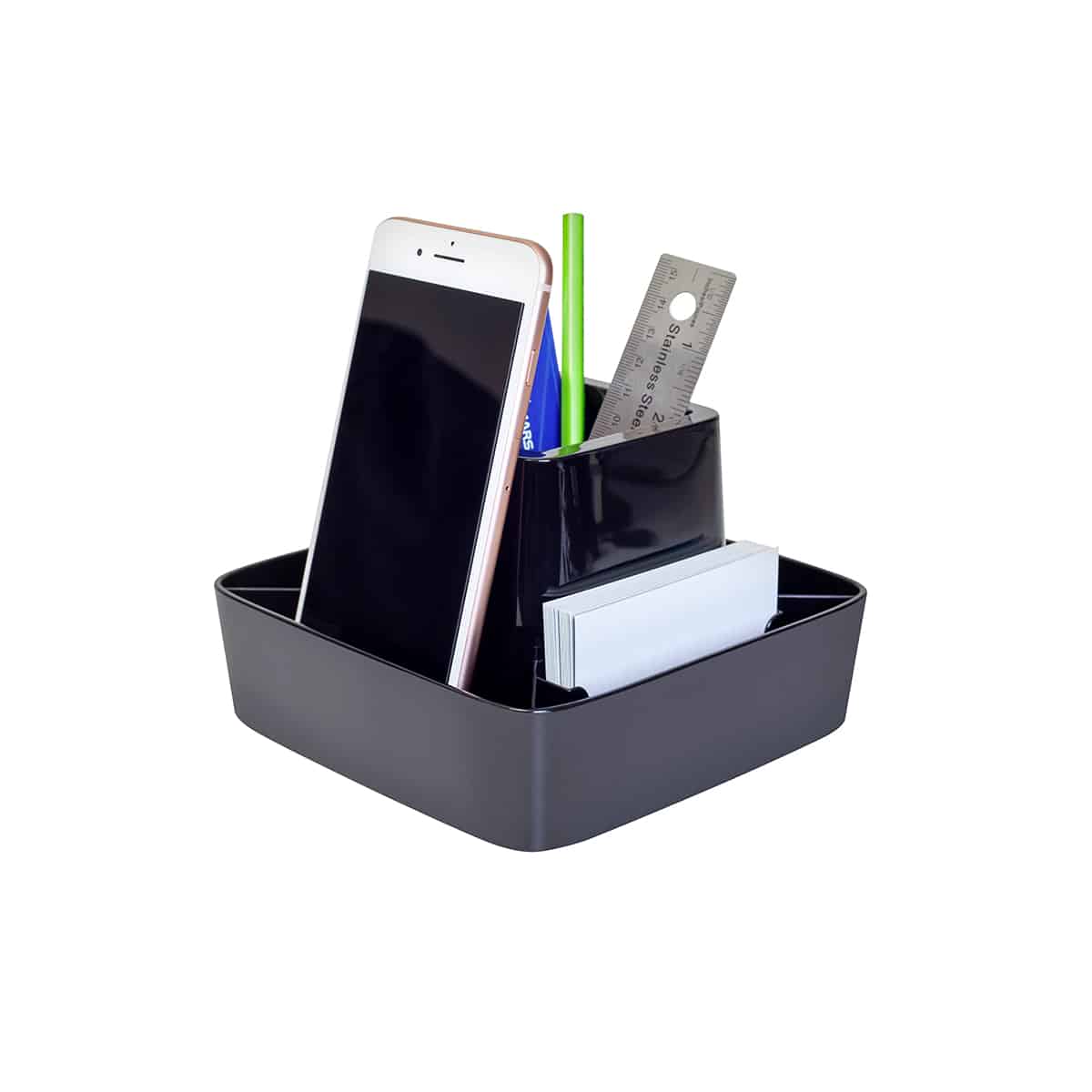 Impressionnez avec notre collection d’accessoires de bureau Modern Gloss. Ces organisateurs de bureau sont faits d’un nouveau polymère en plastique d’âge qui lui donnent un regard à haute brillance et une sensation raide et lourde. Cet organisateur tourne en douceur sur des roulements à billes en acier. Il dispose d’un pot à crayons et de compartiments séparés pour les téléphones portables, les cartes de visite, les blocs-notes et les pinces.