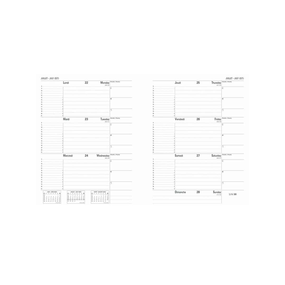 7-1/4 x 9-1/2 po. Août à juillet. Une semaine sur deux pages. Rendez-vous de 8h00 à 21h00 aux heures. Bilingue.